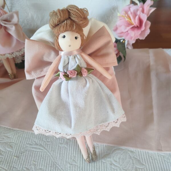 Bomboniera Comunione e Cresima, bambole in stoffa con vestitino rosa e bianco decorato con fiocco e fiorellino in testa, confezionata con sacchetto grande, 9 confetti alla mandorla e biglietto in omaggio.