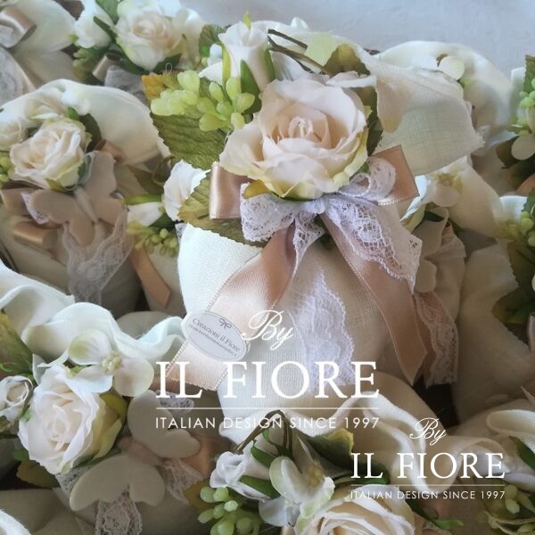 Bomboniera Matrimonio, Comunione, Cresima e anniversario matrimonio. Sacchetto portaconfetti in lino con  fiori e fiocco in pizzo.