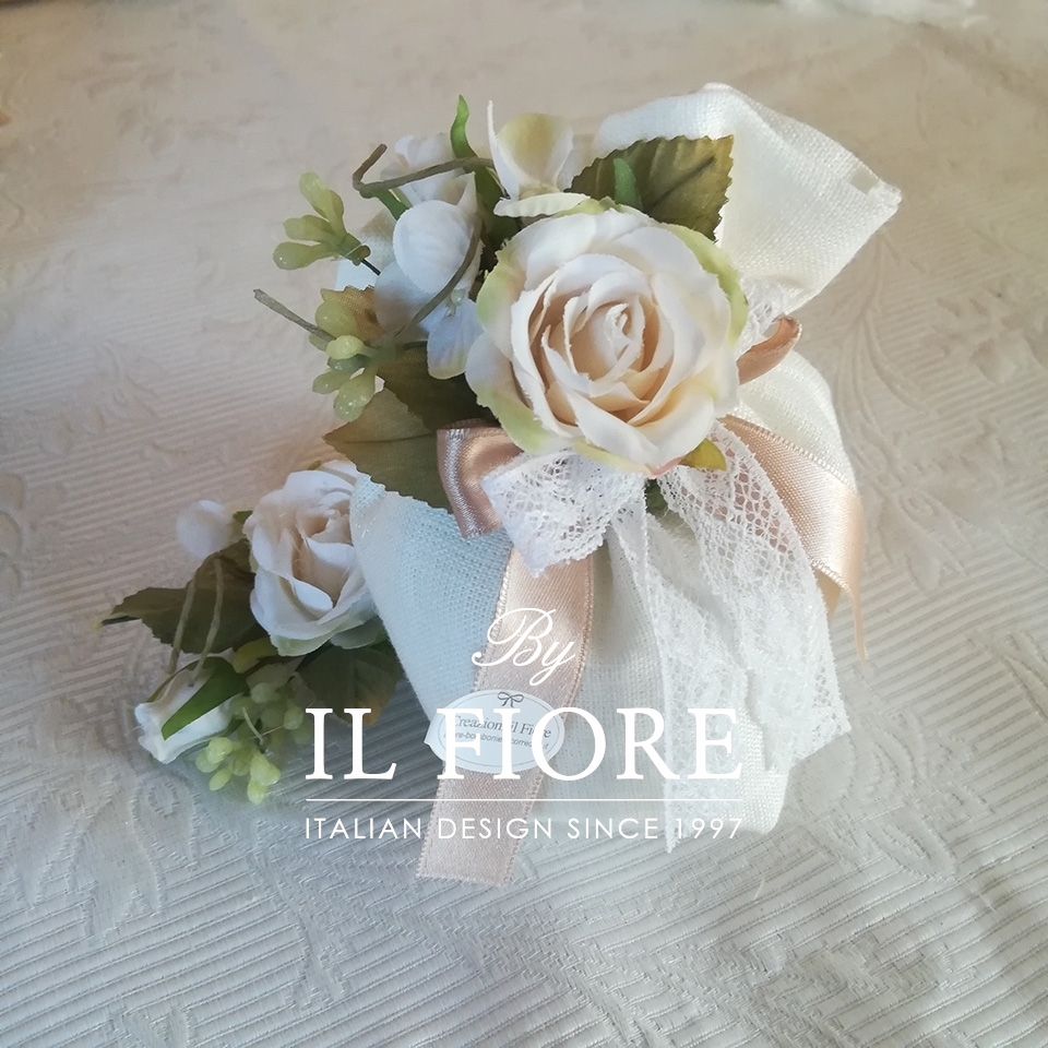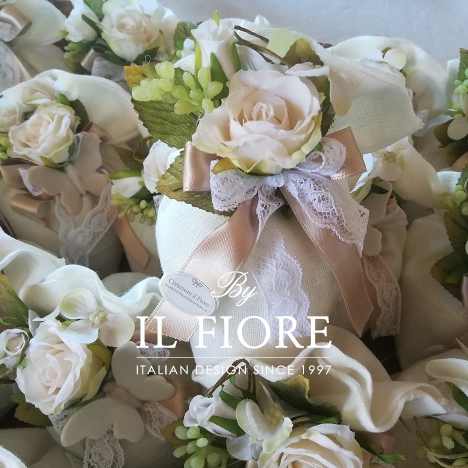 Bomboniera Comunione e Matrimonio sacchetto con fiori e pizzo