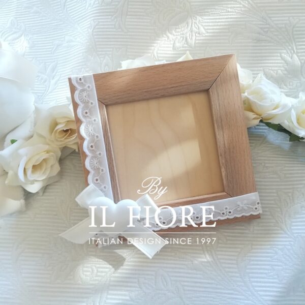 Bomboniera per Comunione, Matrimonio e Cresima portafoto in legno con cuoricino in gesso, decorata con pizzo Sangallo e fiocco di raso.
