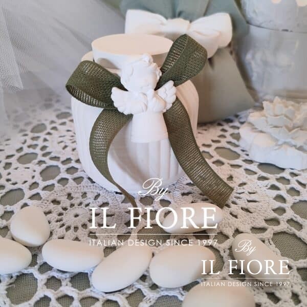 Bomboniera Comunione e Cresima, barattolo in gesso con candela. La bomboniera ha due funzioni come portacandele e portaoggetti, decorato con angioletto in gesso profumato e nastro.