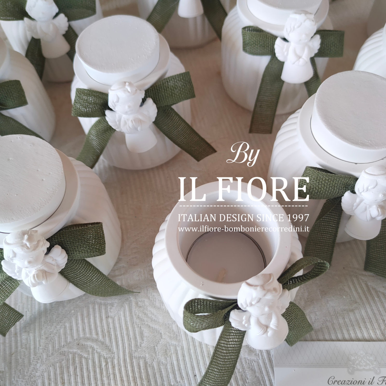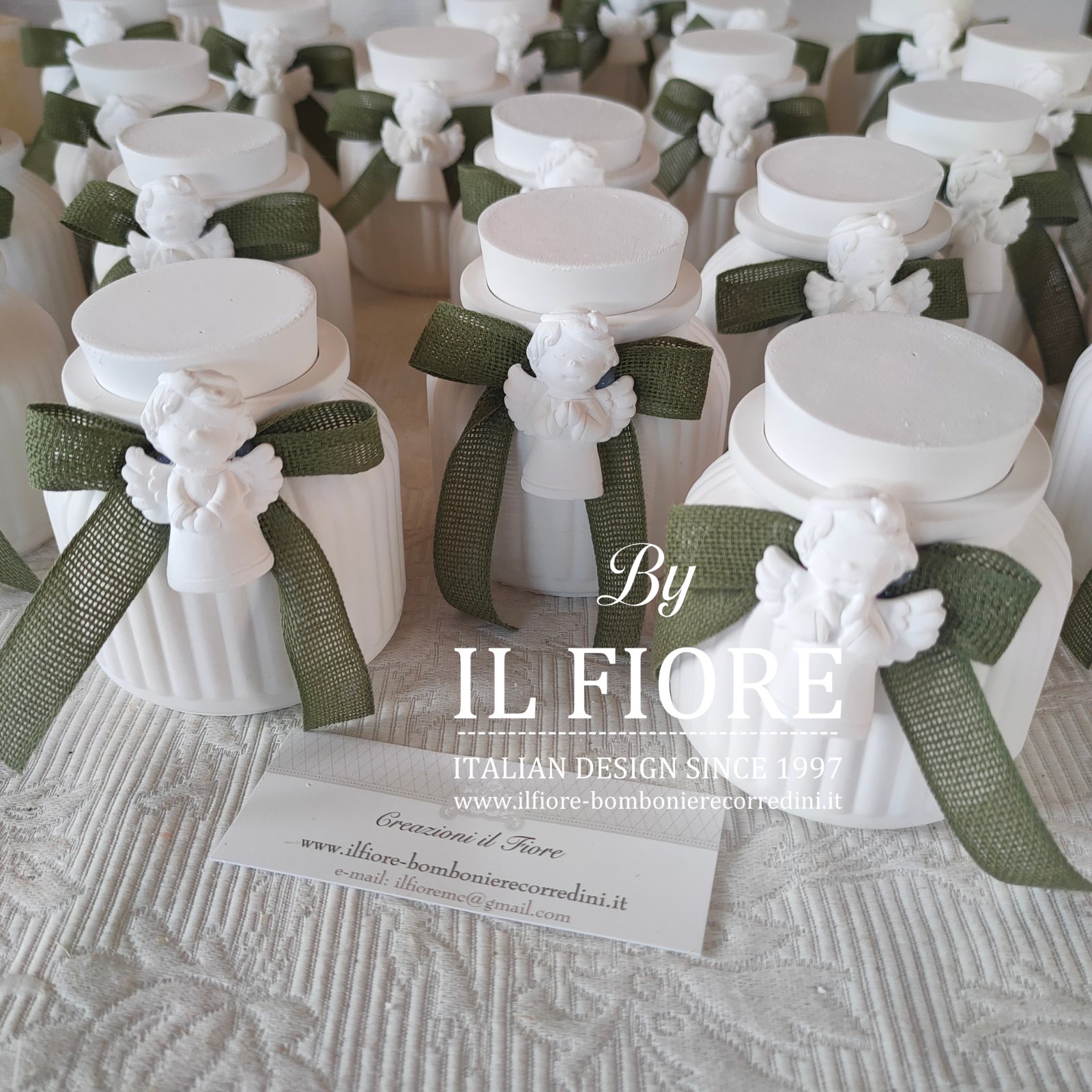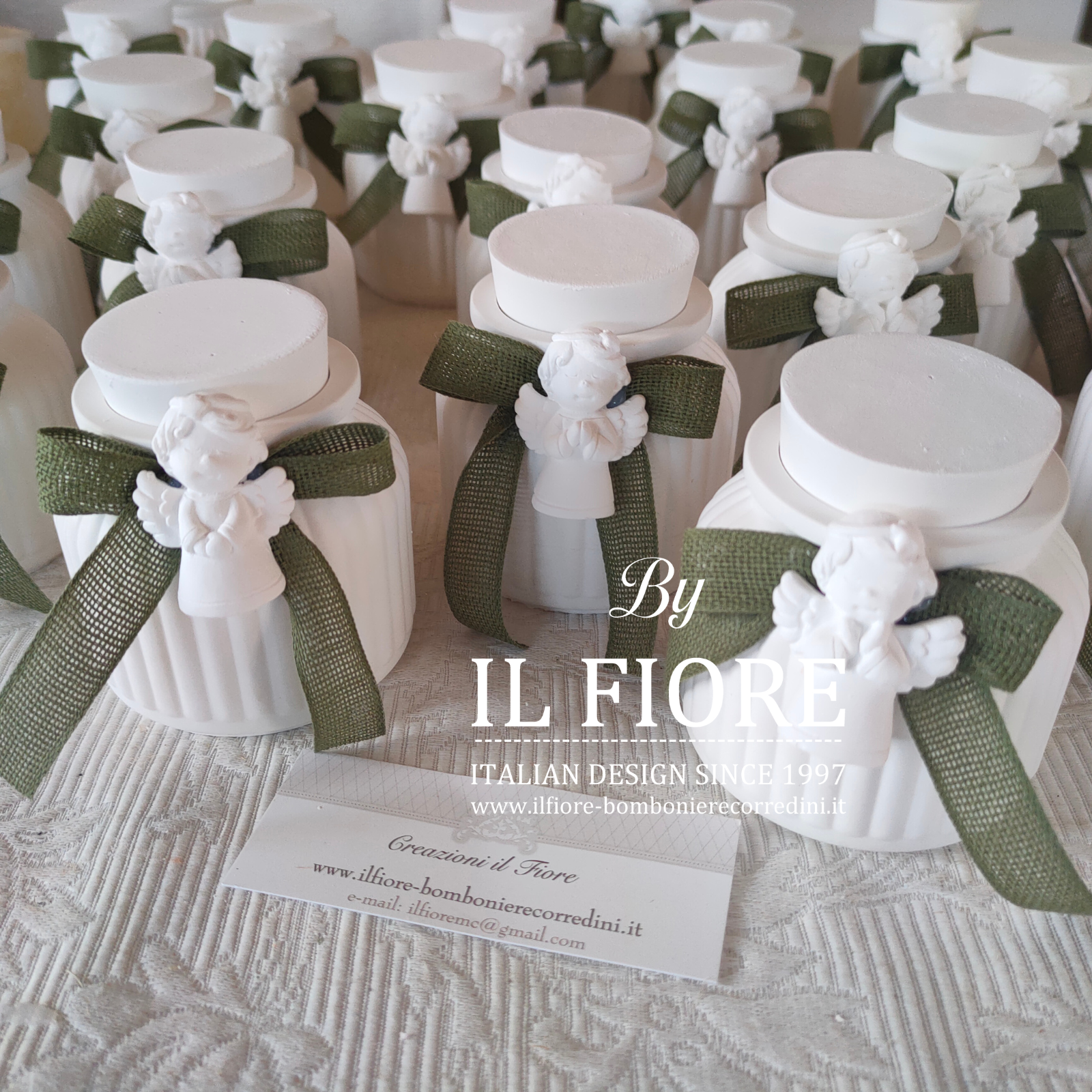 Bomboniera Comunione e Cresima, barattolo in gesso con candela. La bomboniera ha due funzioni come portacandele e portaoggetti, decorato con angioletto in gesso profumato e nastro.
