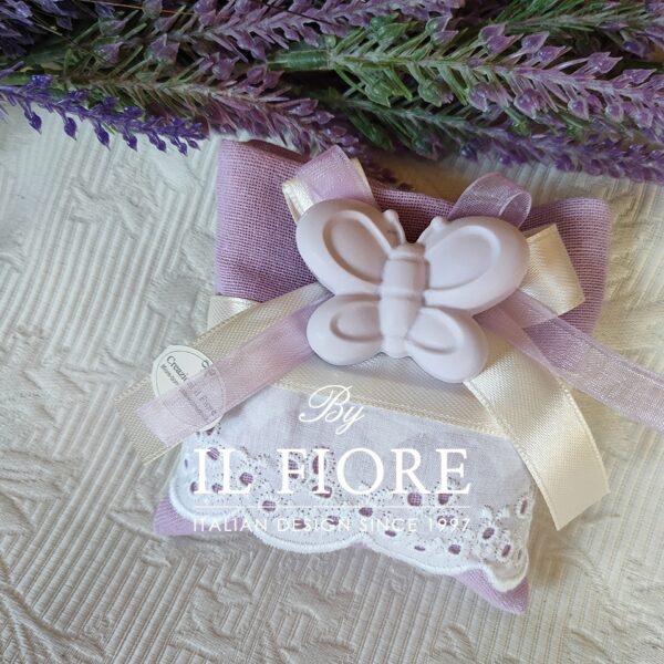 Bomboniera Comunione, Cresima, matrimonio e anniversario matrimonio, sacchetto portaconfetti provenzale decorata con San Gallo, nastro in organza colore glicine e nastro di raso e farfalla di colore lilla in gesso profumato.