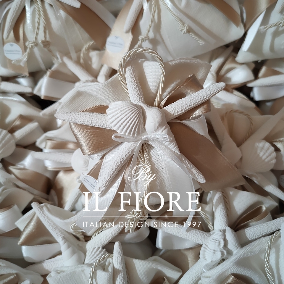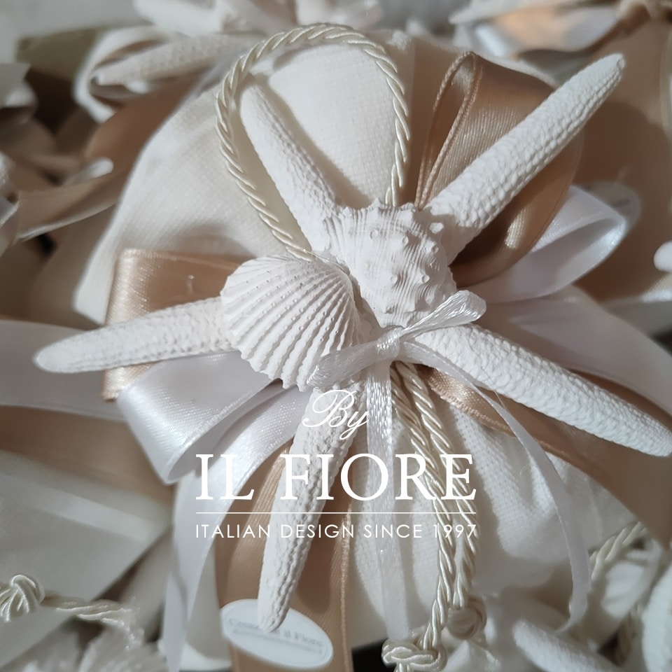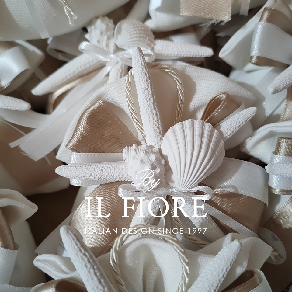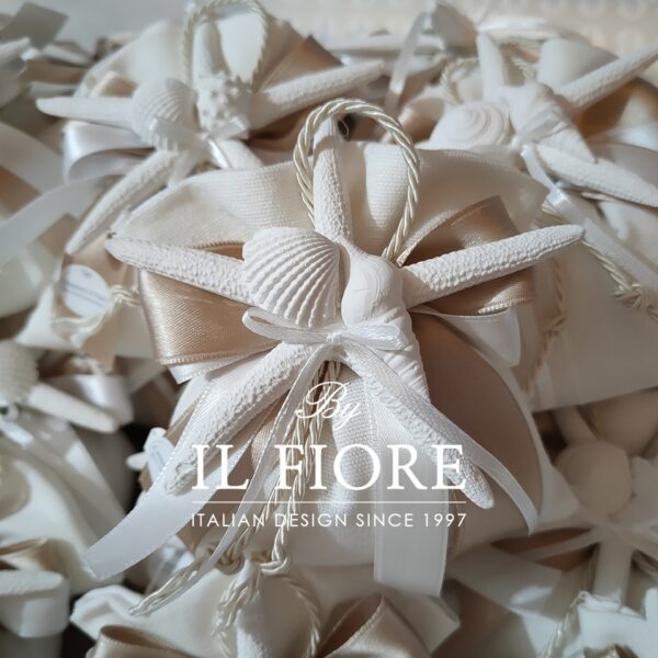 Bomboniera Comunione, Cresima e matrimonio sacchetto in cotone bianco con stella marina e conchiglie in gesso, nastro di raso color tortora e bianco, cordoncino avorio.