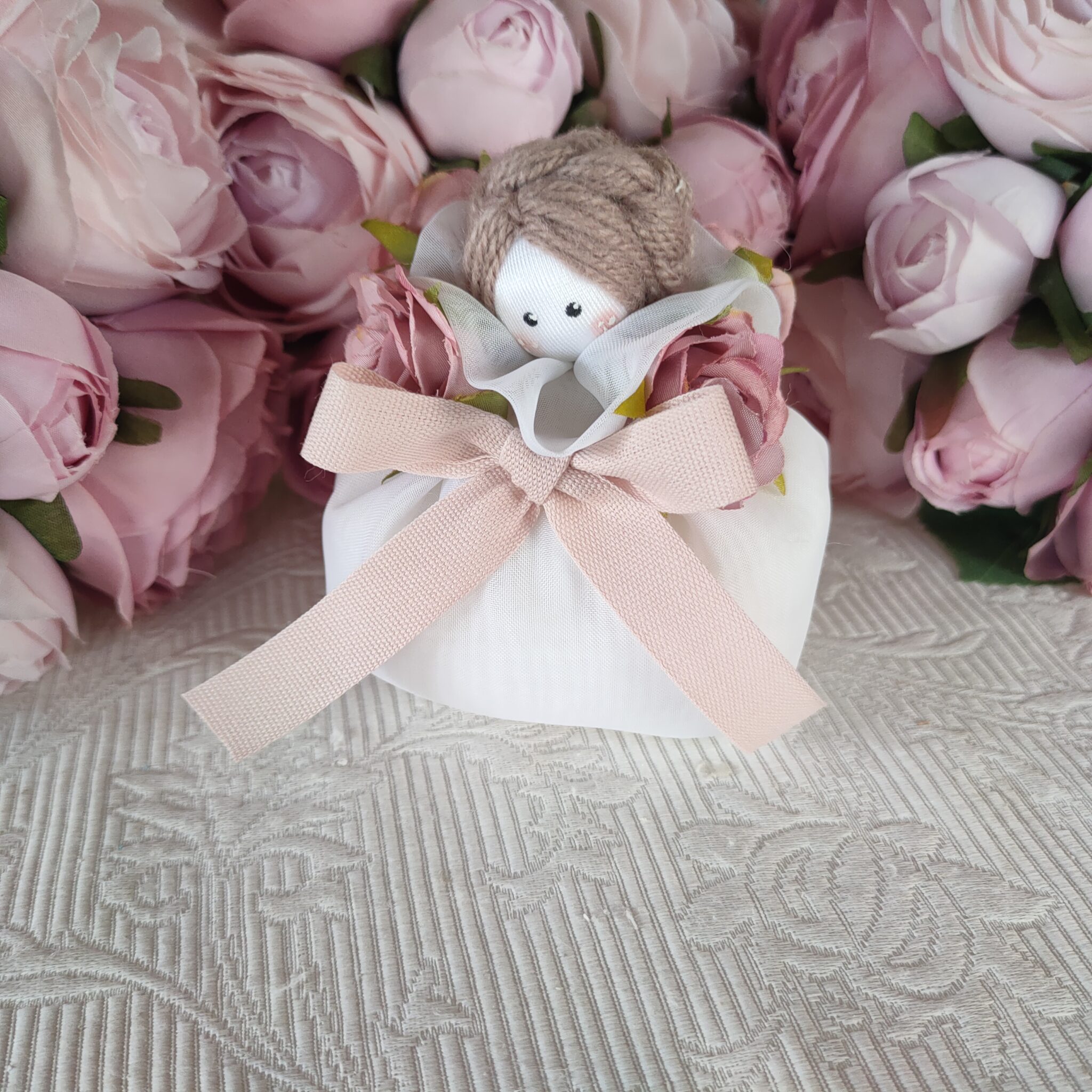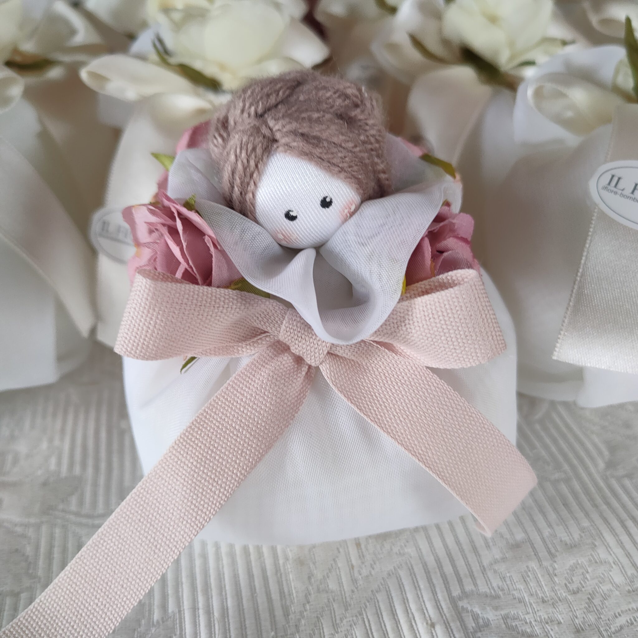 Bomboniera Comunione sacchetto con testolina bambola e fiore