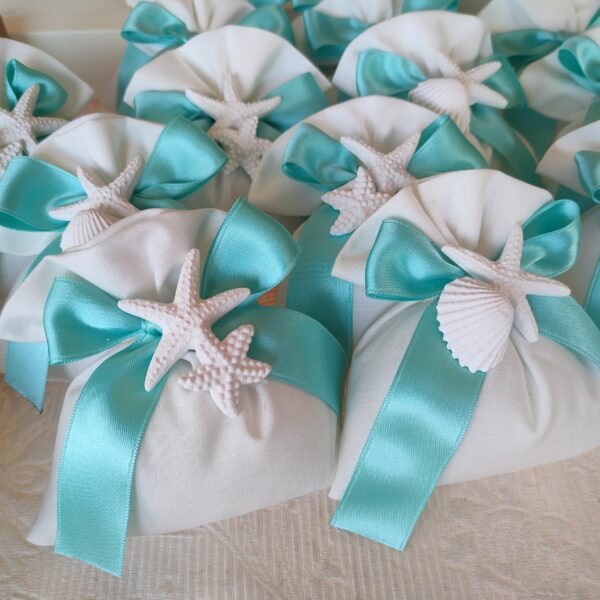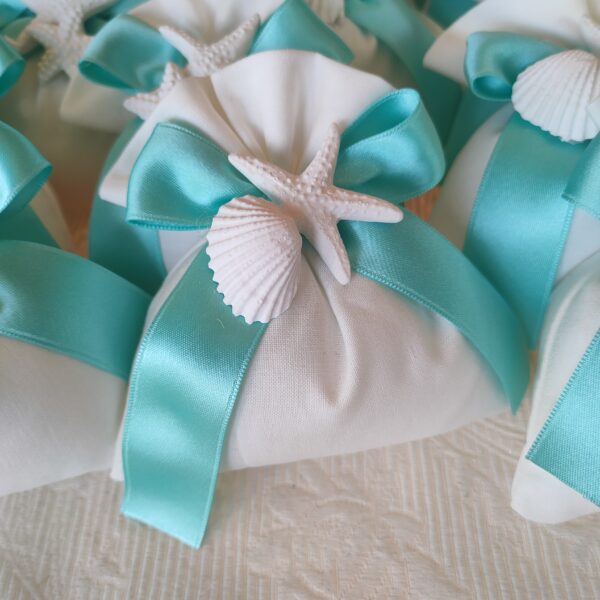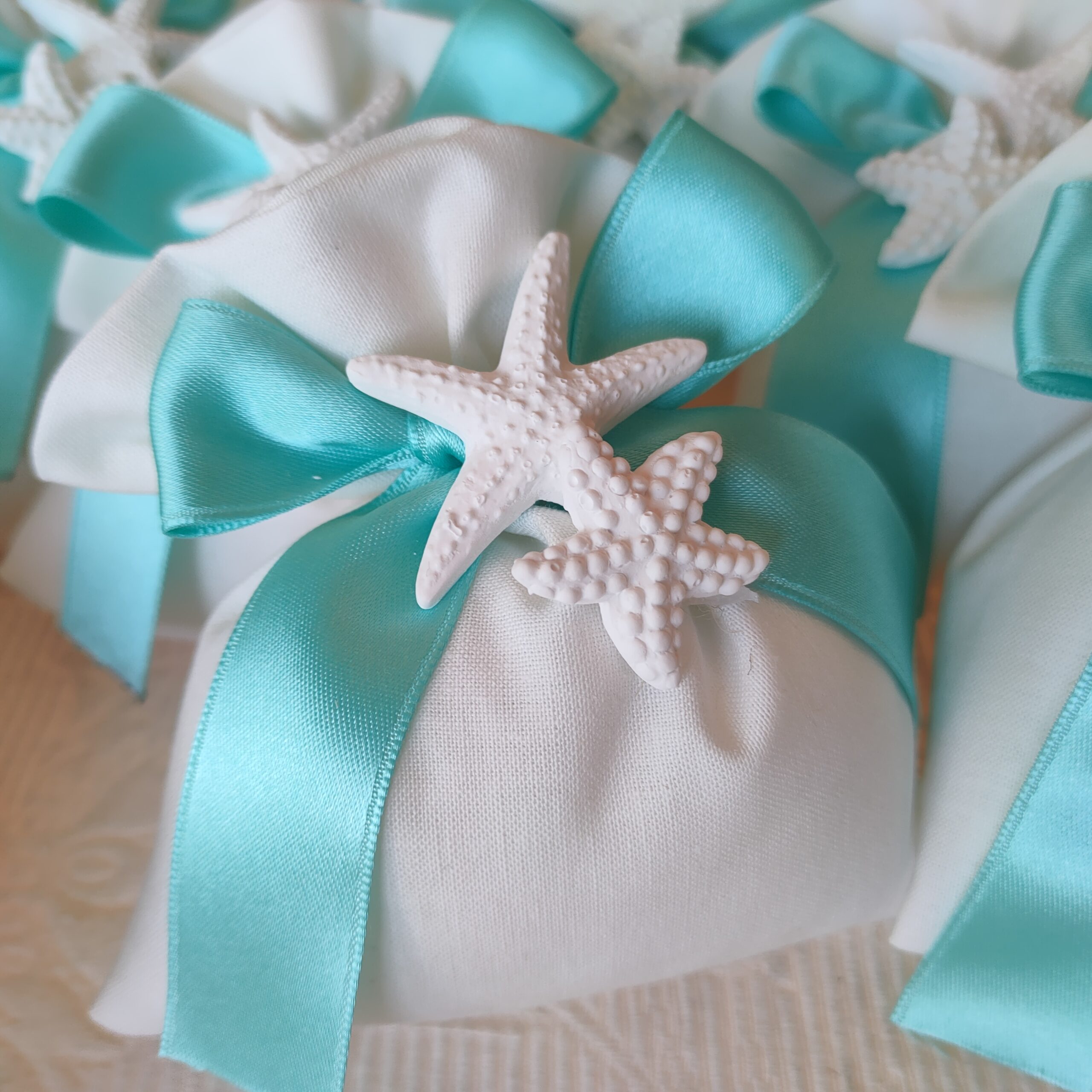 Bomboniera Comunione Bimbo e Bimba, sacchetto portaconfetti in tessuto cotone con nastro in raso verde tiffany, stelle marine e conchiglie in gessetto profumato.
