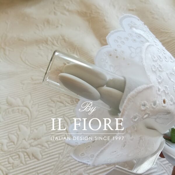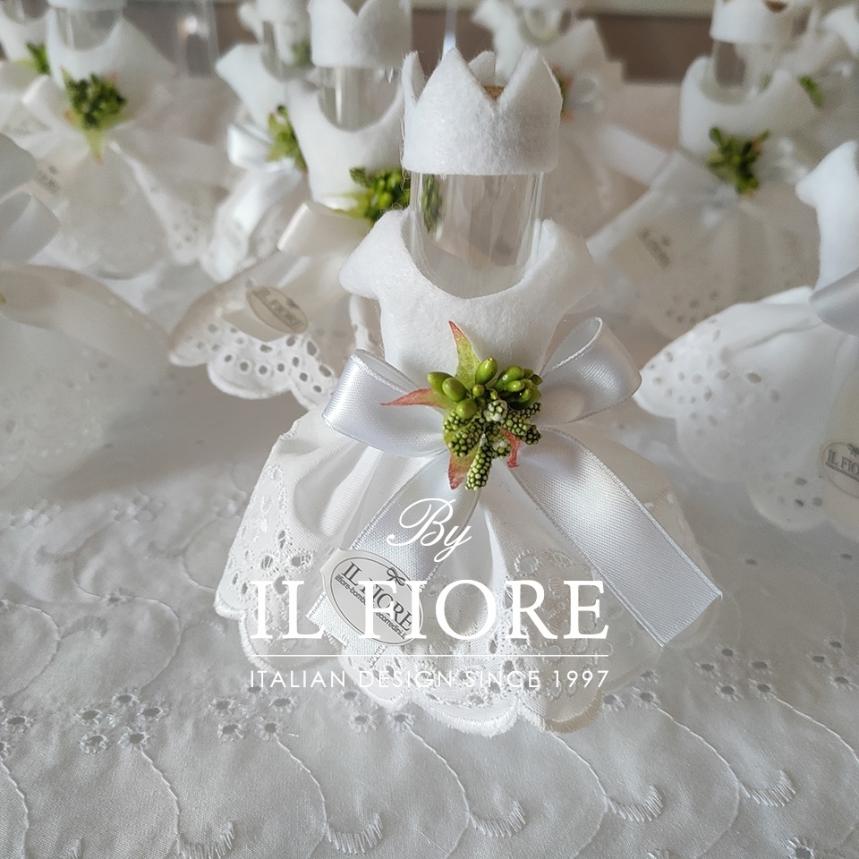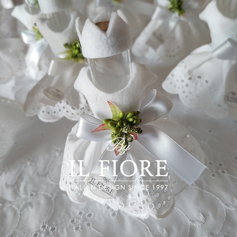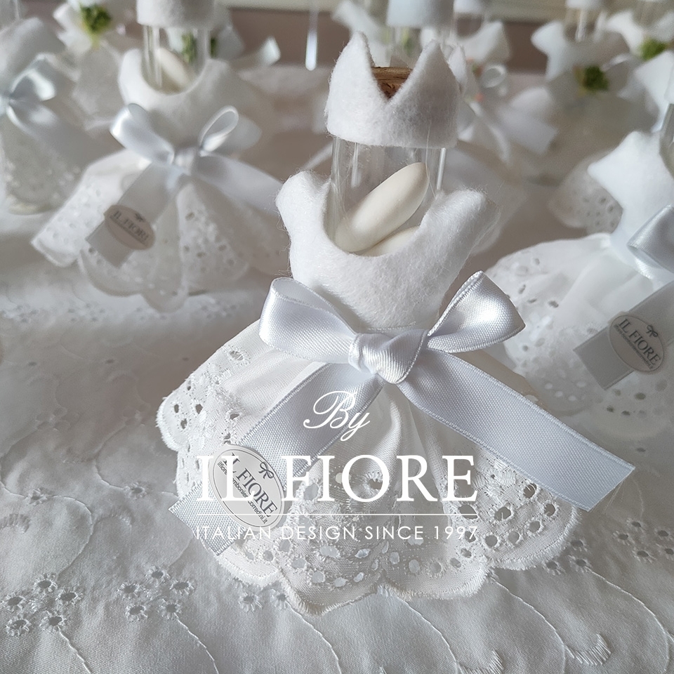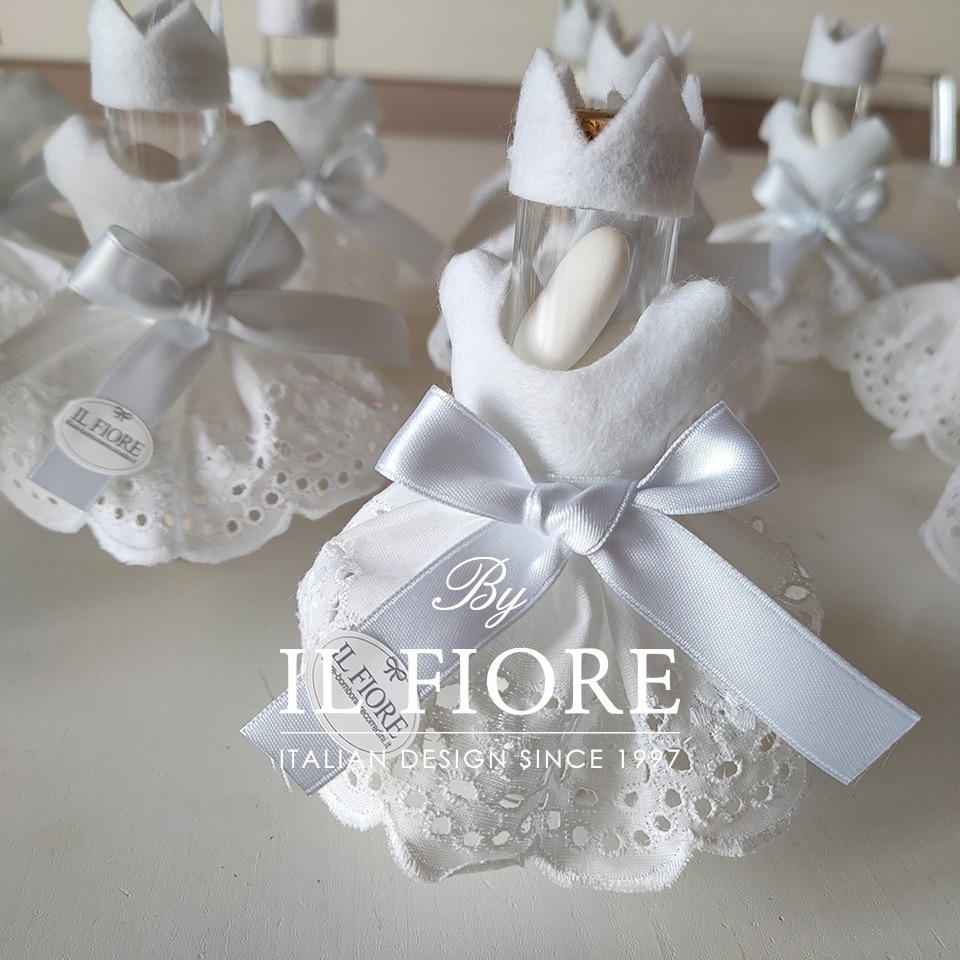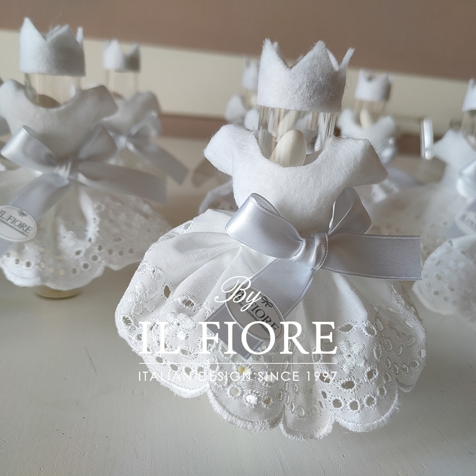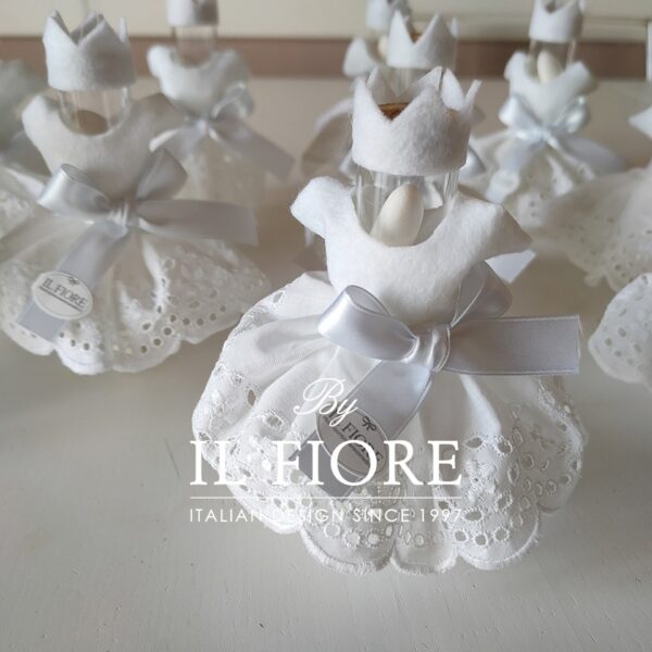 Bomboniera Comunione e Cresima vestito Comunione Principessa in Sangallo interamente cucito a mano, con provetta in vetro, comprende 7 confetti alla mandorla e biglietto in omaggio. E’ una bellissima bomboniera originale e preziosa per coronare il giorno piu’ bello della vostra Principessa. Altezza 12 cm.