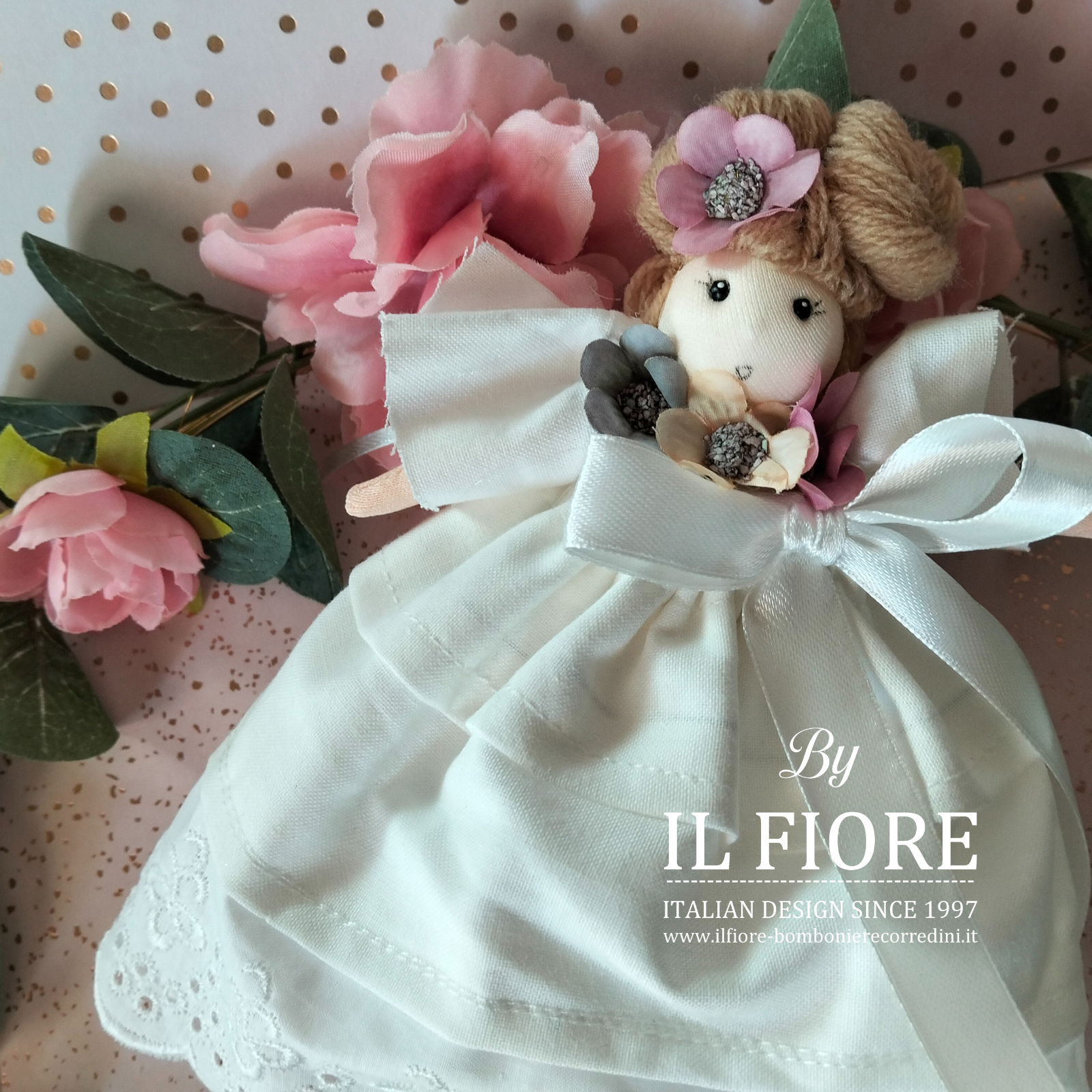 Bomboniera Comunione e Cresima, bambola decorata con fiori e vestito con merletto Sangallo.