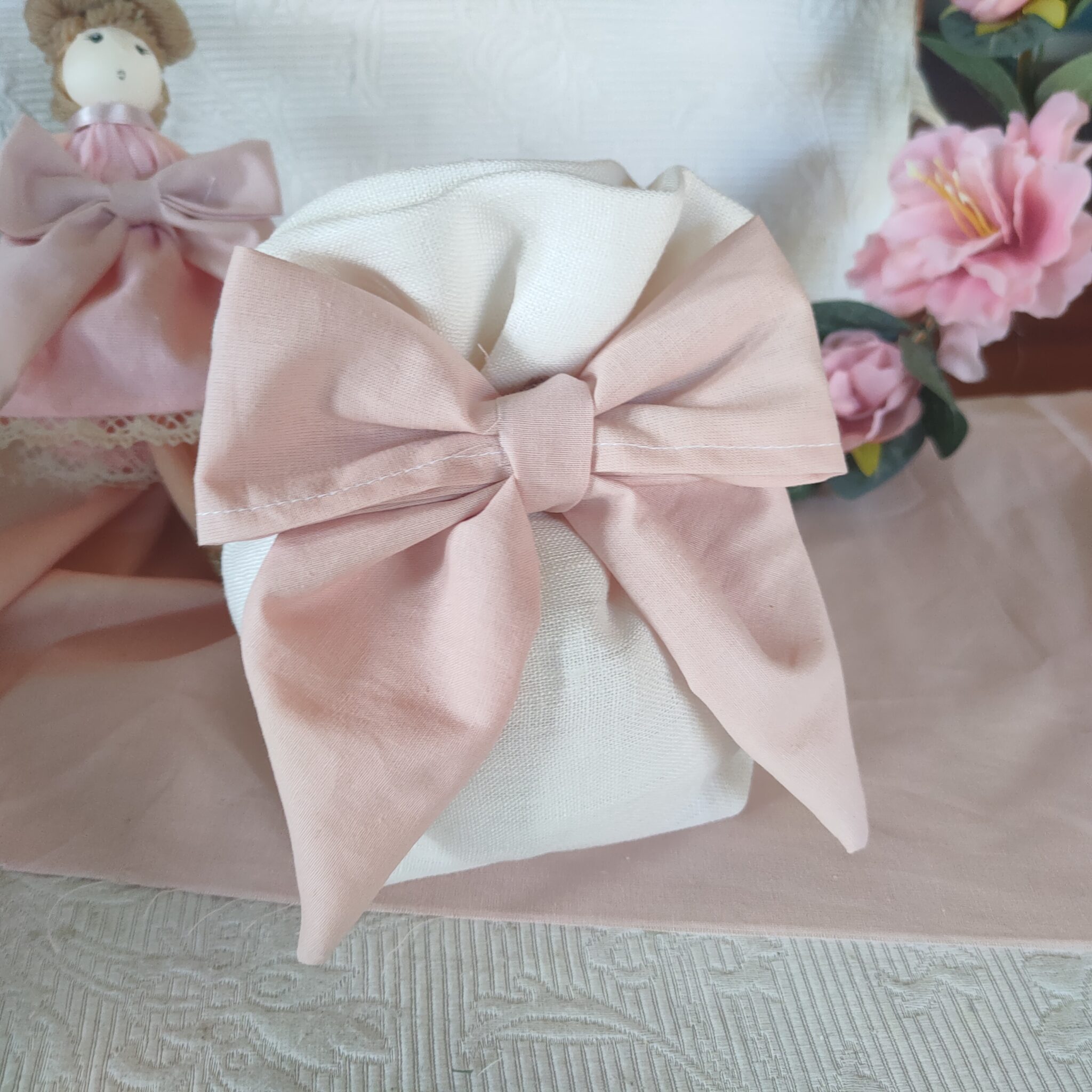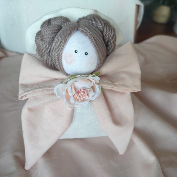 Bomboniera Cresima e Comunione sacchetto con testa bambolina fiocco e fiore