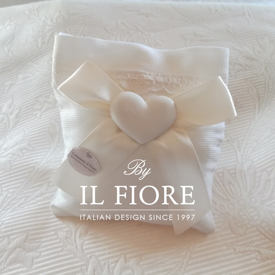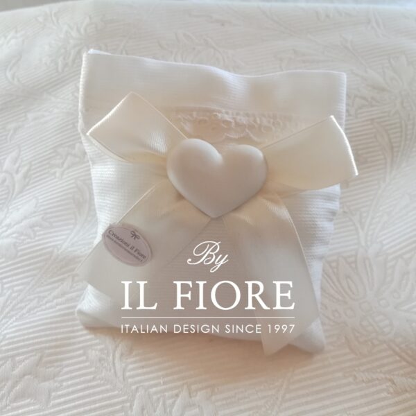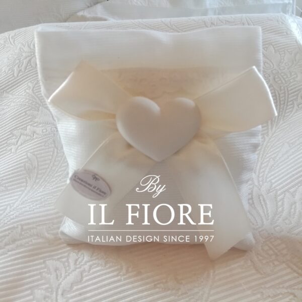 Bomboniera Cresima sacchetto con pizzo Sangallo cuore in gesso e nastro di raso
