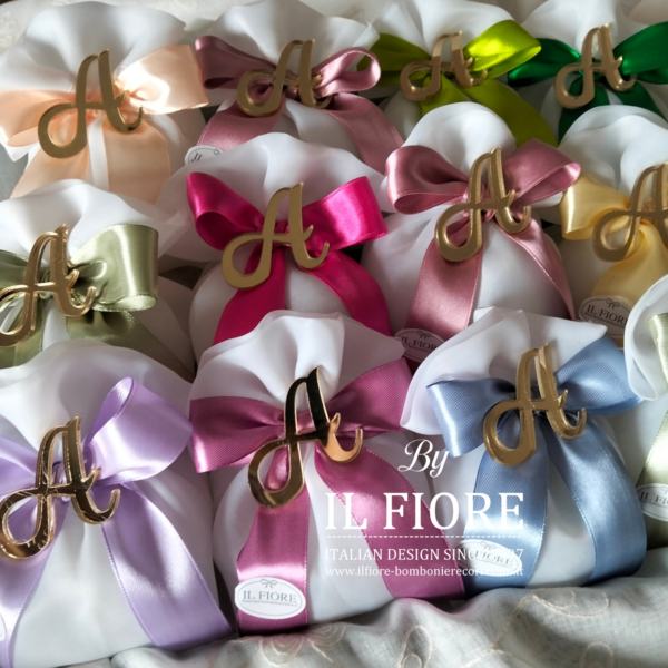 Bomboniera Comunione e Cresima, raffinato sacchetto in organza decorato con lettera dorata e nastri colorati.