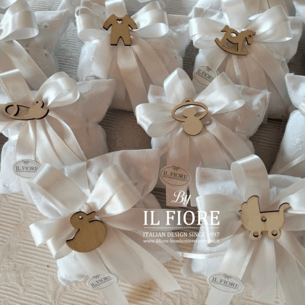 Bomboniera cuscino portaconfetti Sangallo con calamite in legno baby