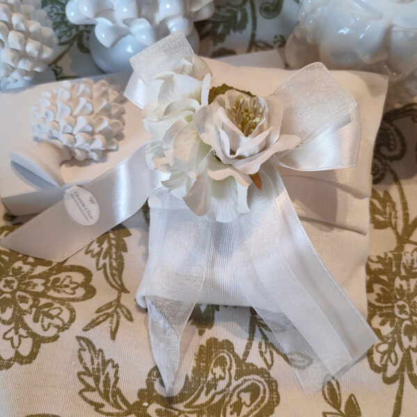 Bomboniera matrimonio e anniversario di matrimonio, sacchetto busta con fiore e doppio fiocco in raso e organza.