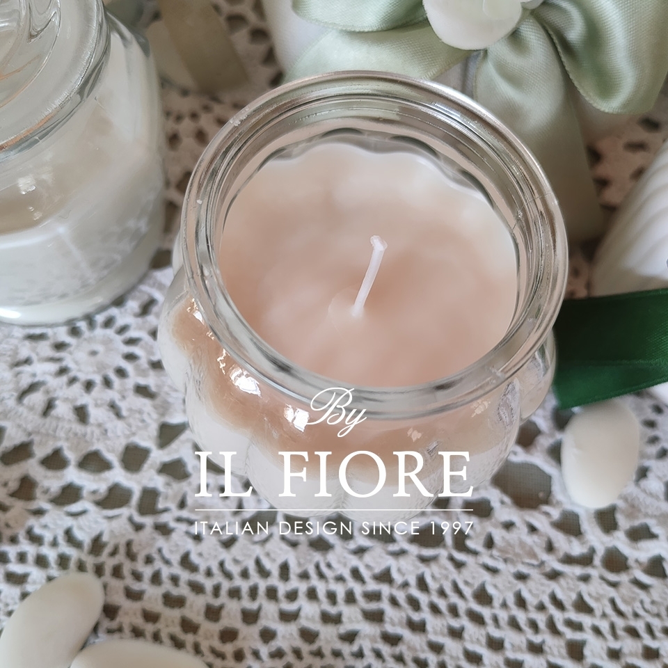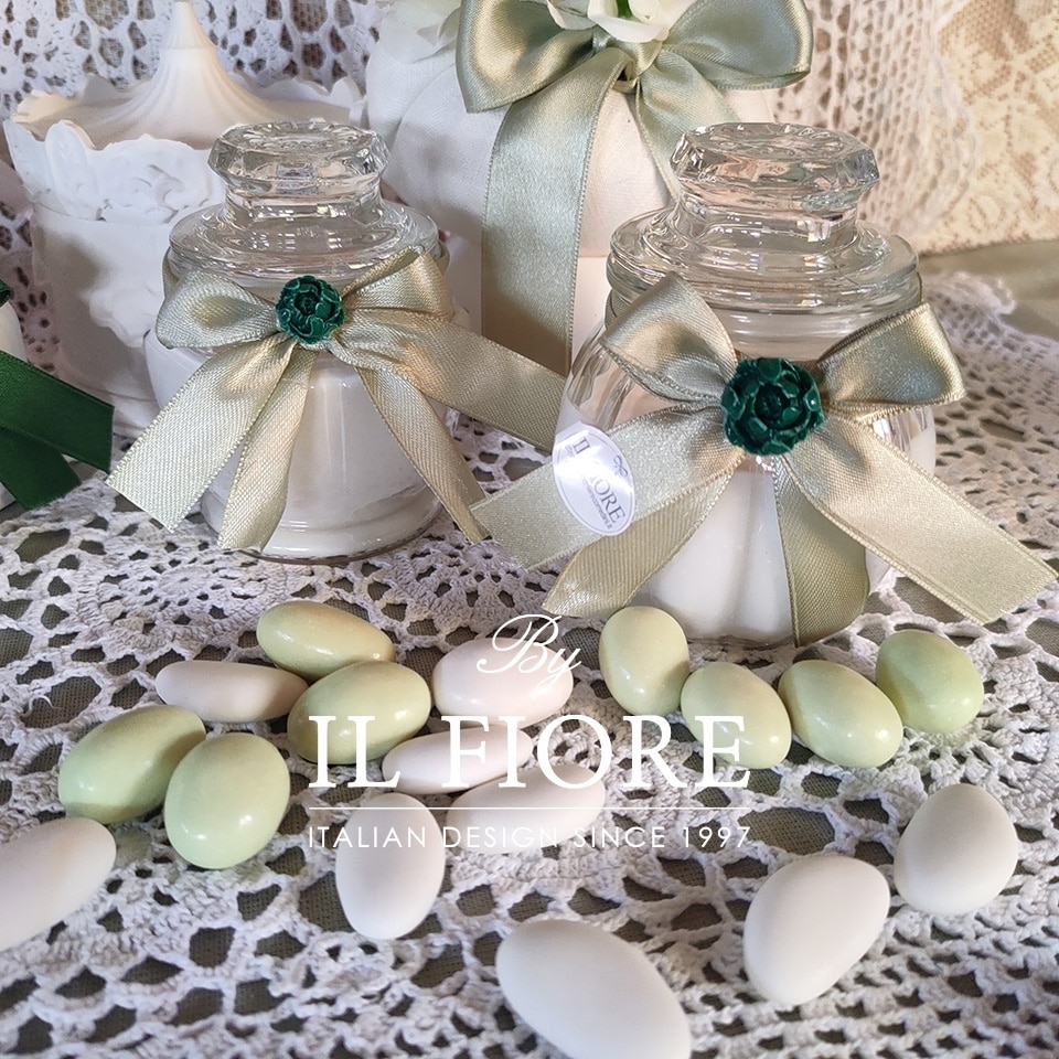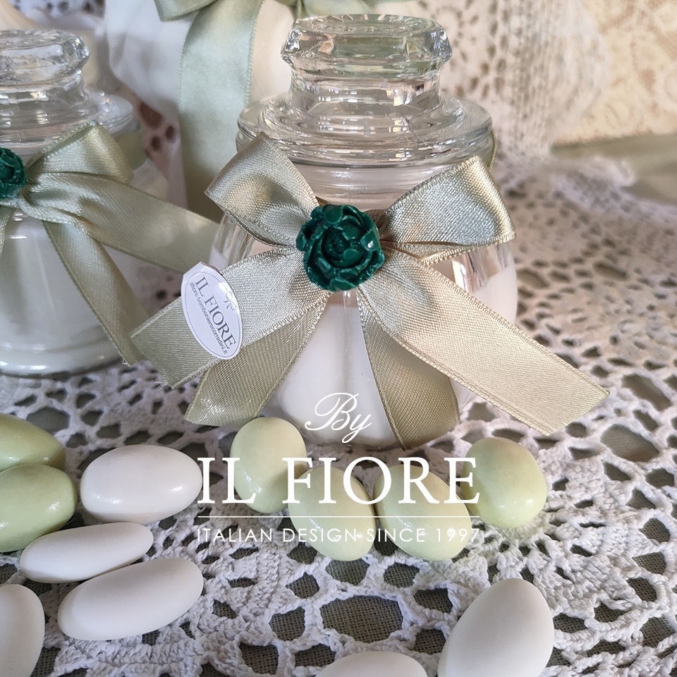 Bomboniera matrimonio, barattolo portagioie in vetro con candela. La bomboniera ha due funzioni come portacandele e portagioie, decorata con fiocco e peonia.