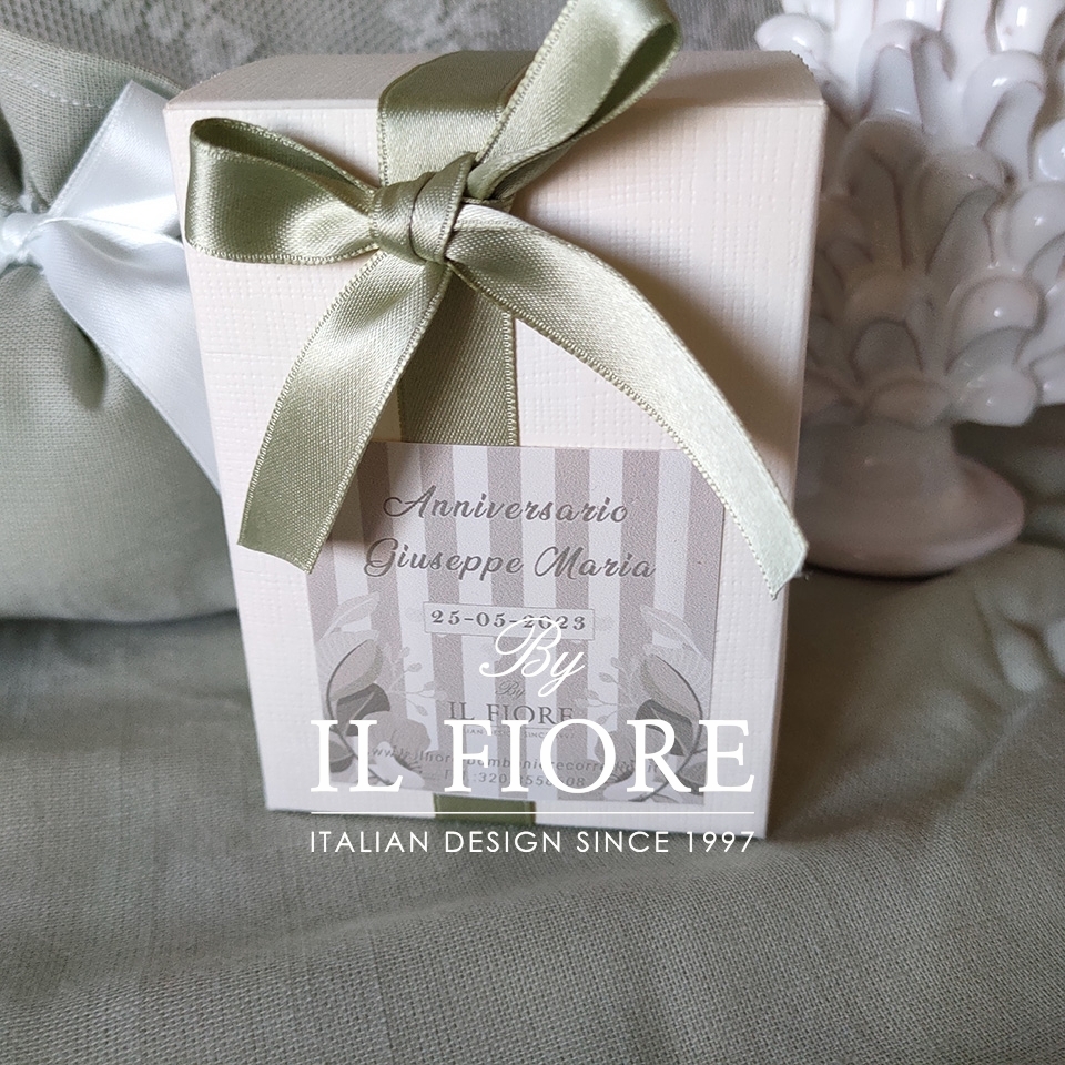 Confezionata con scatola, fiocco e tag con nomi sposi e data cerimonia.