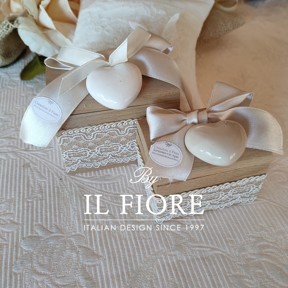 Bomboniera matrimonio preziosa  scatola bauletto in legno con cuori in ceramica e fiocco in raso. Intorno alla scatola di legno un raffinato nastro in pizzo.