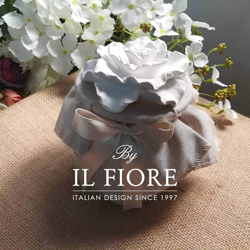 Bomboniera matrimonio, comunione, cresima e anniversario matrimonio, candela in barattolo di gesso, decorata con stoffa e gessetto fiore Gardenia. Completa di ciuffetto. Creazioni fatte a mano.