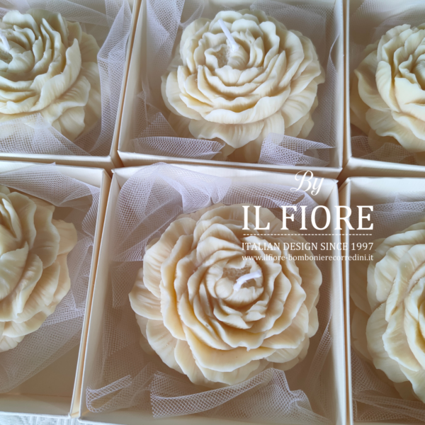 Bomboniera candela peonia per matrimonio. La bomboniera è confezionata con scatola, fiocco e tulle.