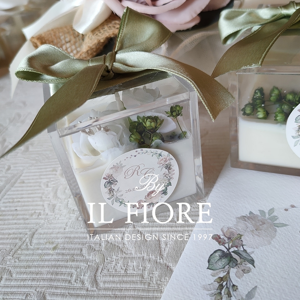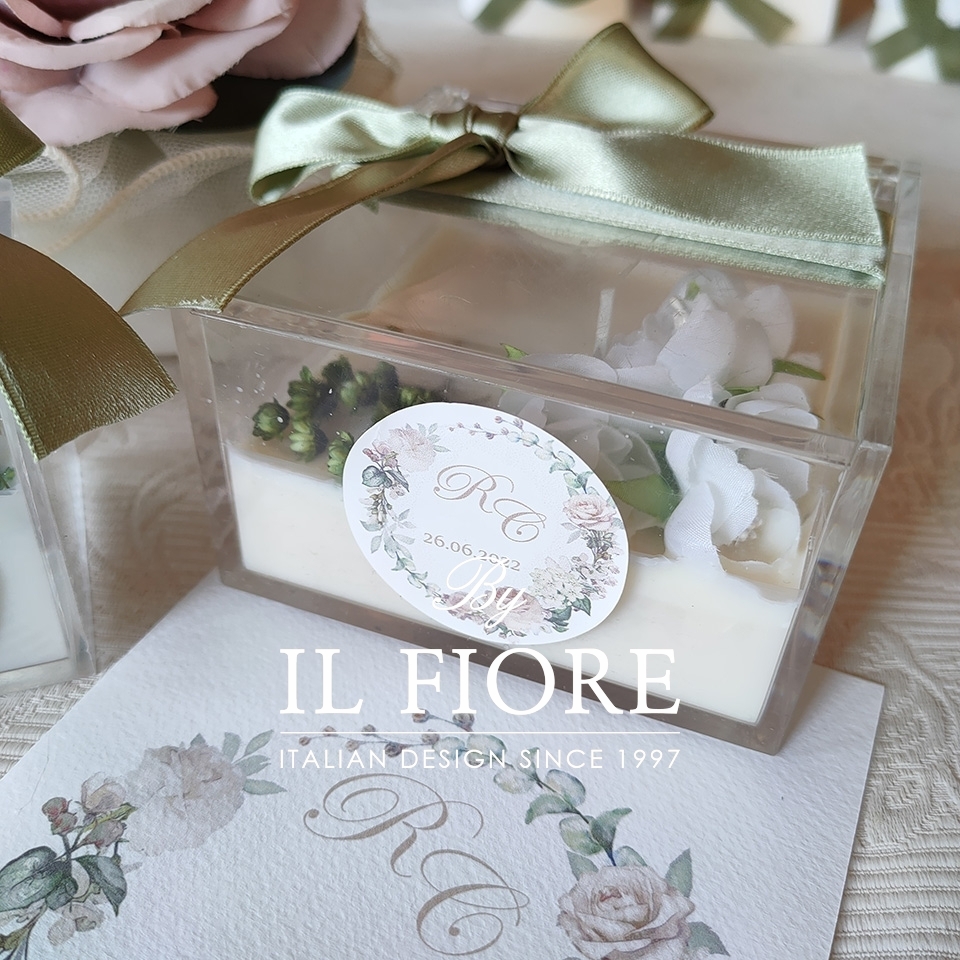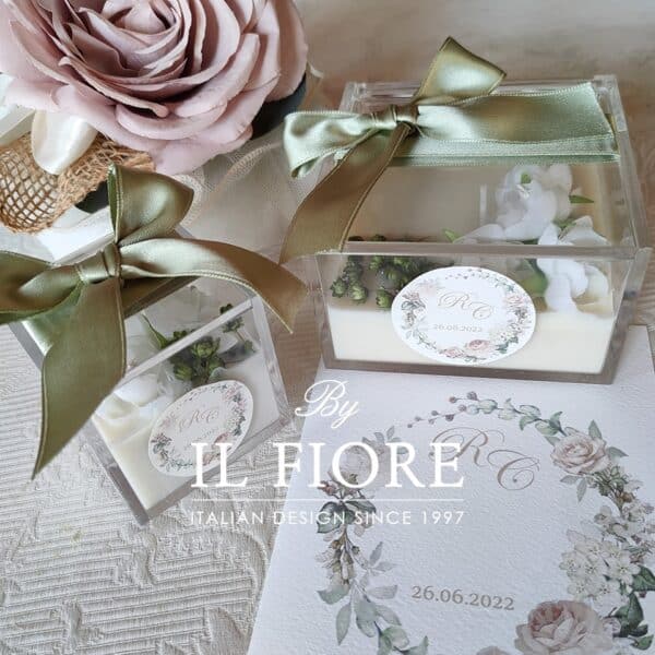 Bomboniera candele in raffinatissime scatole plexiglass decorate con fiori e nastro di raso.