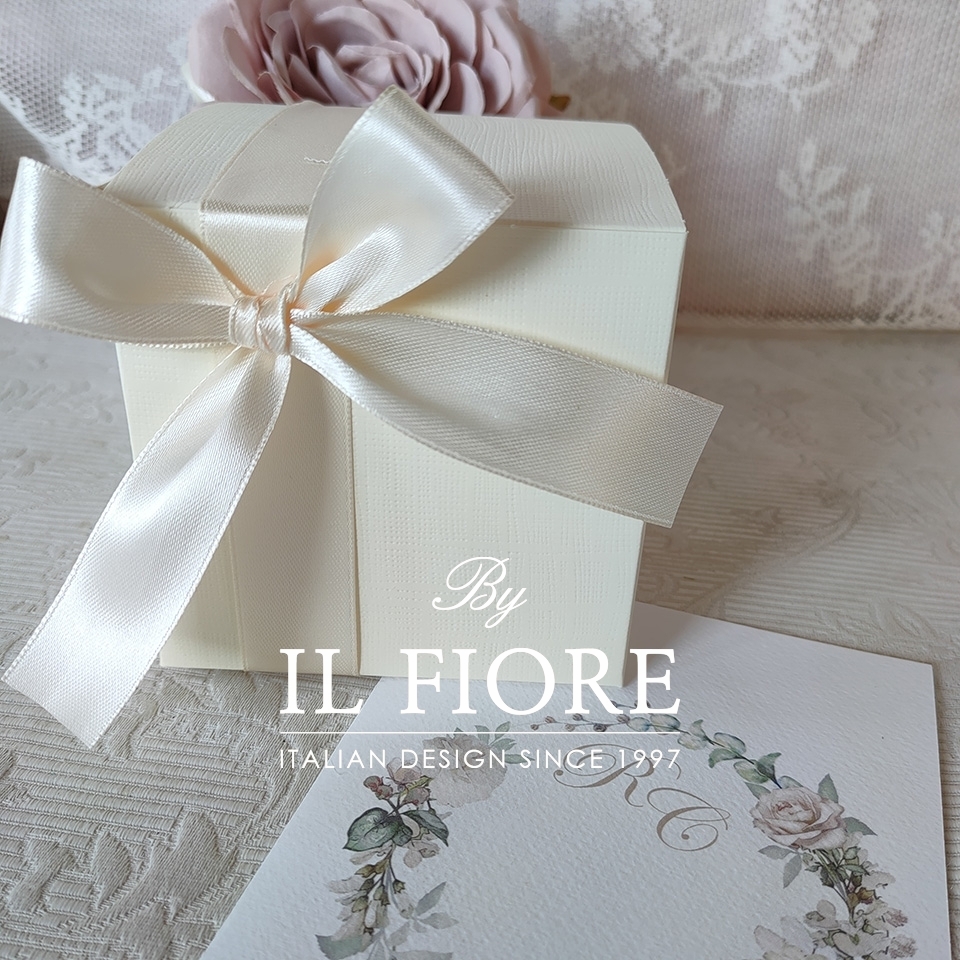 La bomboniera è confezionata con scatola, confetti e fiocco.