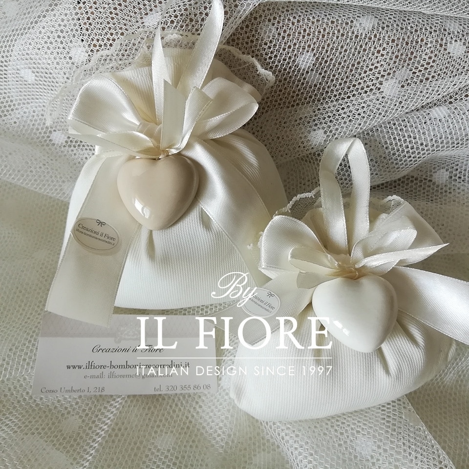 Bomboniera matrimonio, Comunione, cresima e anniversario di matrimonio. Sacchetto in piquet con bordura in tulle ricamato e decorato con calamite cuore in ceramica e fiocco in raso.