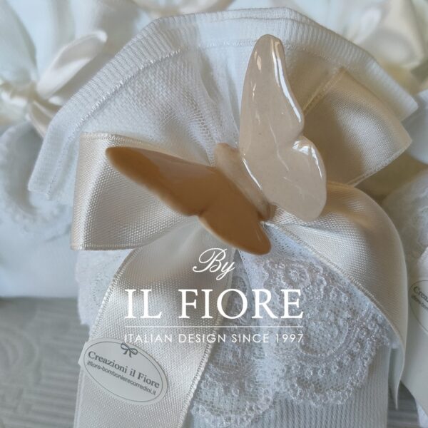 Bomboniera Matrimonio con farfalla in ceramica e sacchetto pizzo francese