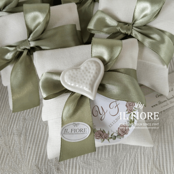 Bomboniera matrimonio. Sacchetto busta con cuore in ceramica calamita, tag personalizzabile con lettere chiuso con fiocco in raso.