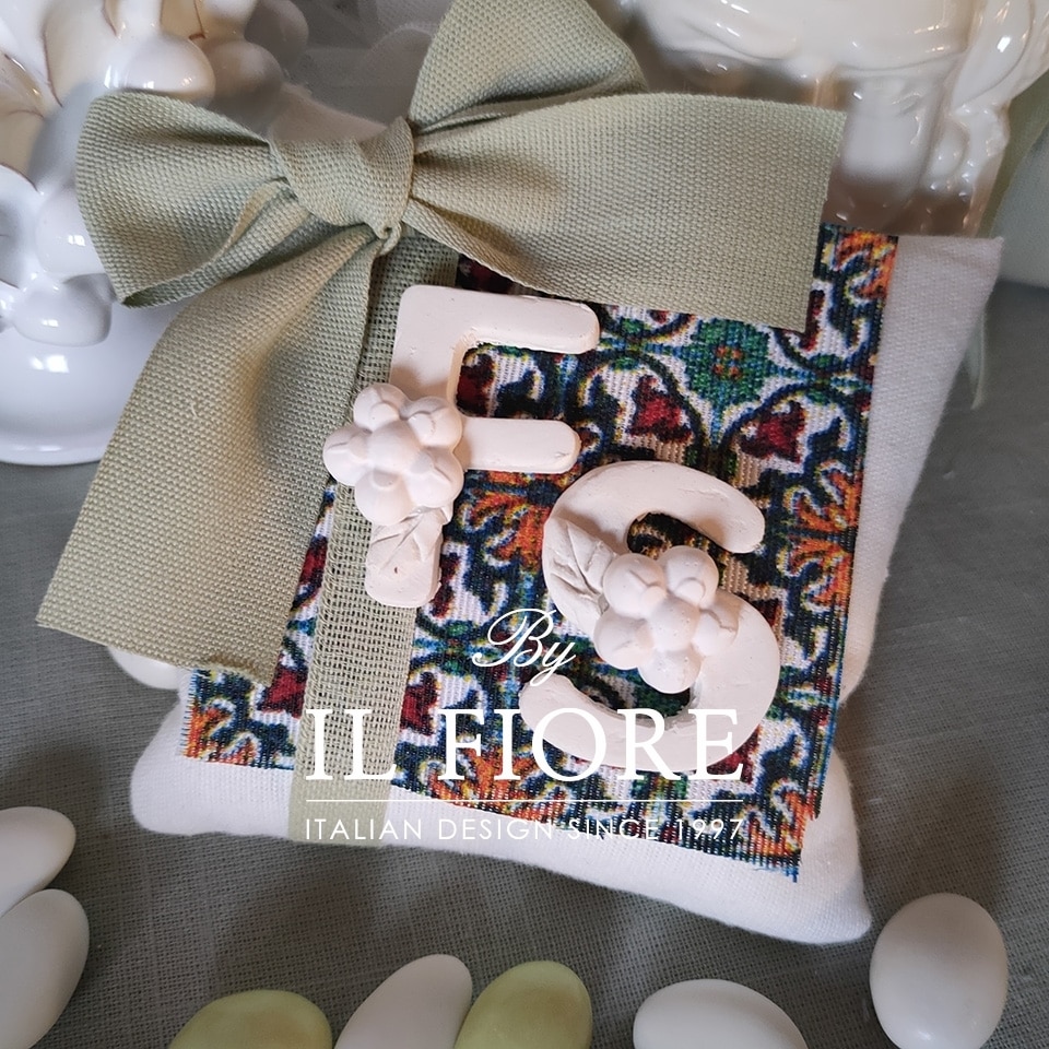 Bomboniera matrimonio, cuscino profumato personalizzabile con iniziali e calamita, confezione con scatola, tag e fiocco.