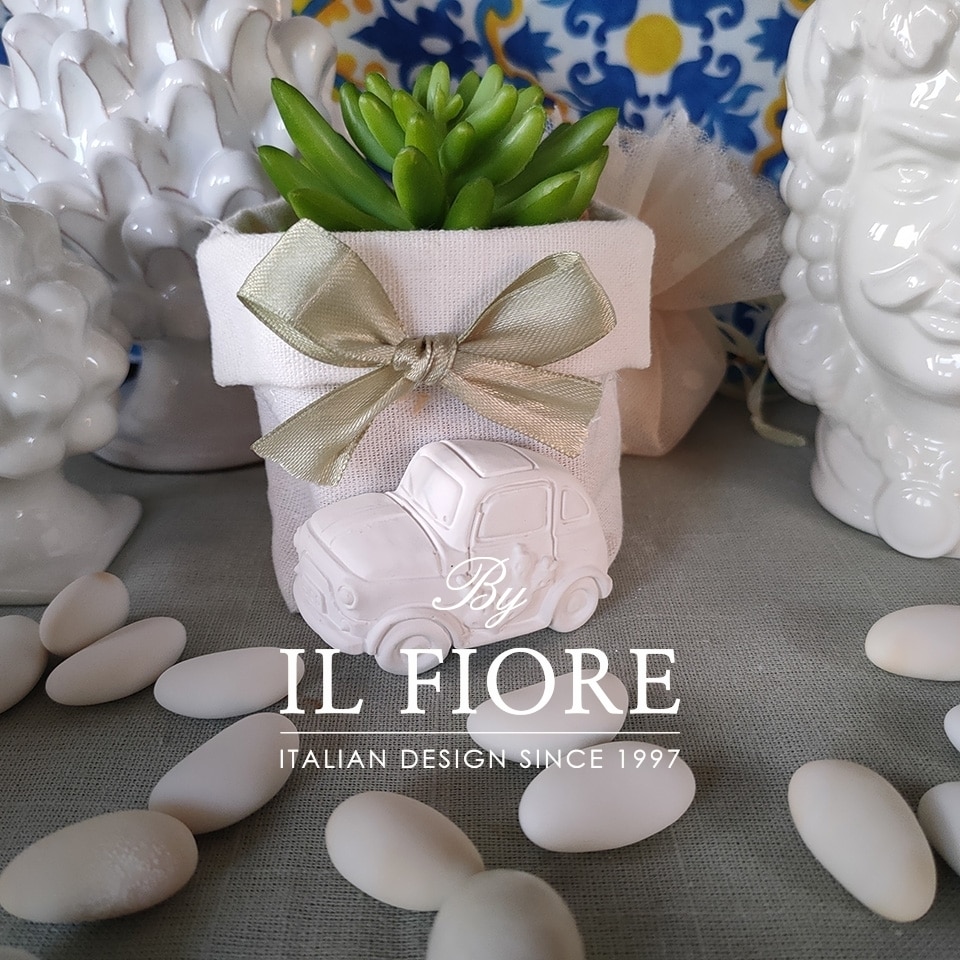 Bomboniera matrimonio. Bomboniera con piantine grasse VERE e MISTE decorata con 500 e ape siciliana in gesso.