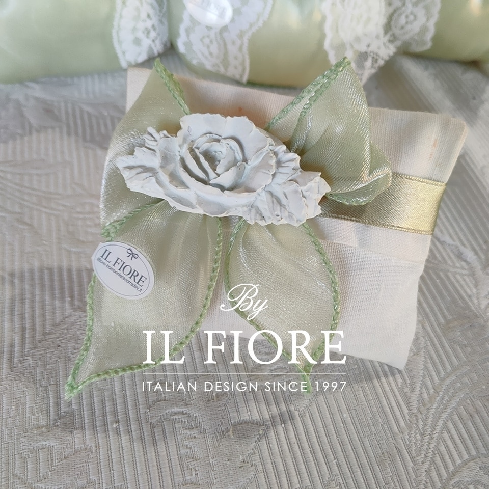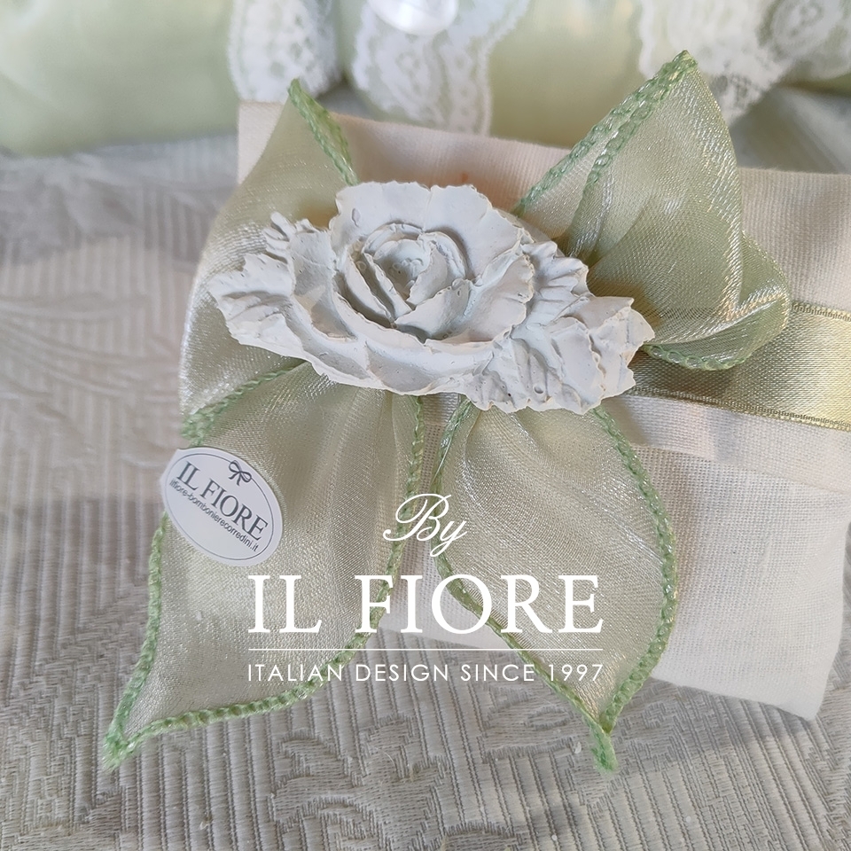 Bomboniera Matrimonio, Comunione, Cresima e anniversario matrimonio. Il sacchetto busta portaconfetti è decorata con peonia in gesso profumato di colore salvia chiaro e fiocco.