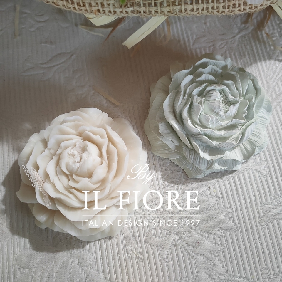 Bomboniera peonia per Matrimonio, Comunione, Cresima e anniversario matrimonio, sacchetto ciuffetto in tulle con peonia in gesso profumato di colore verde salvia e bianco, nastro in raso. Confezione scatola con 5 confetti alla mandorla classica e nastro di raso. Il colore del nastro si può cambiare.