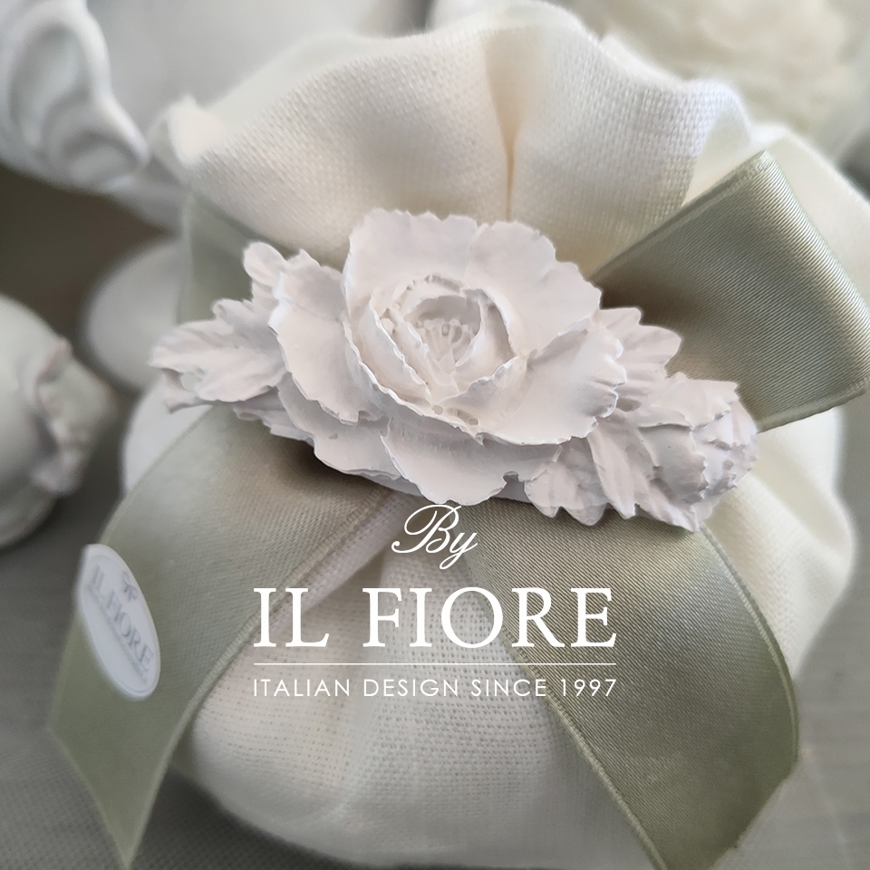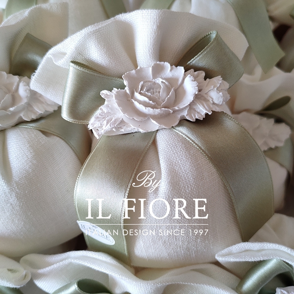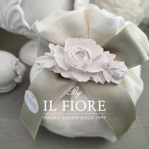Bomboniera Matrimonio, Comunione, Cresima e anniversario matrimonio, sacchetto portaconfetti in lino con fiore peonia in gesso di colore bianco e nastro di raso verde salvia. Il colore del nastro si può cambiare.