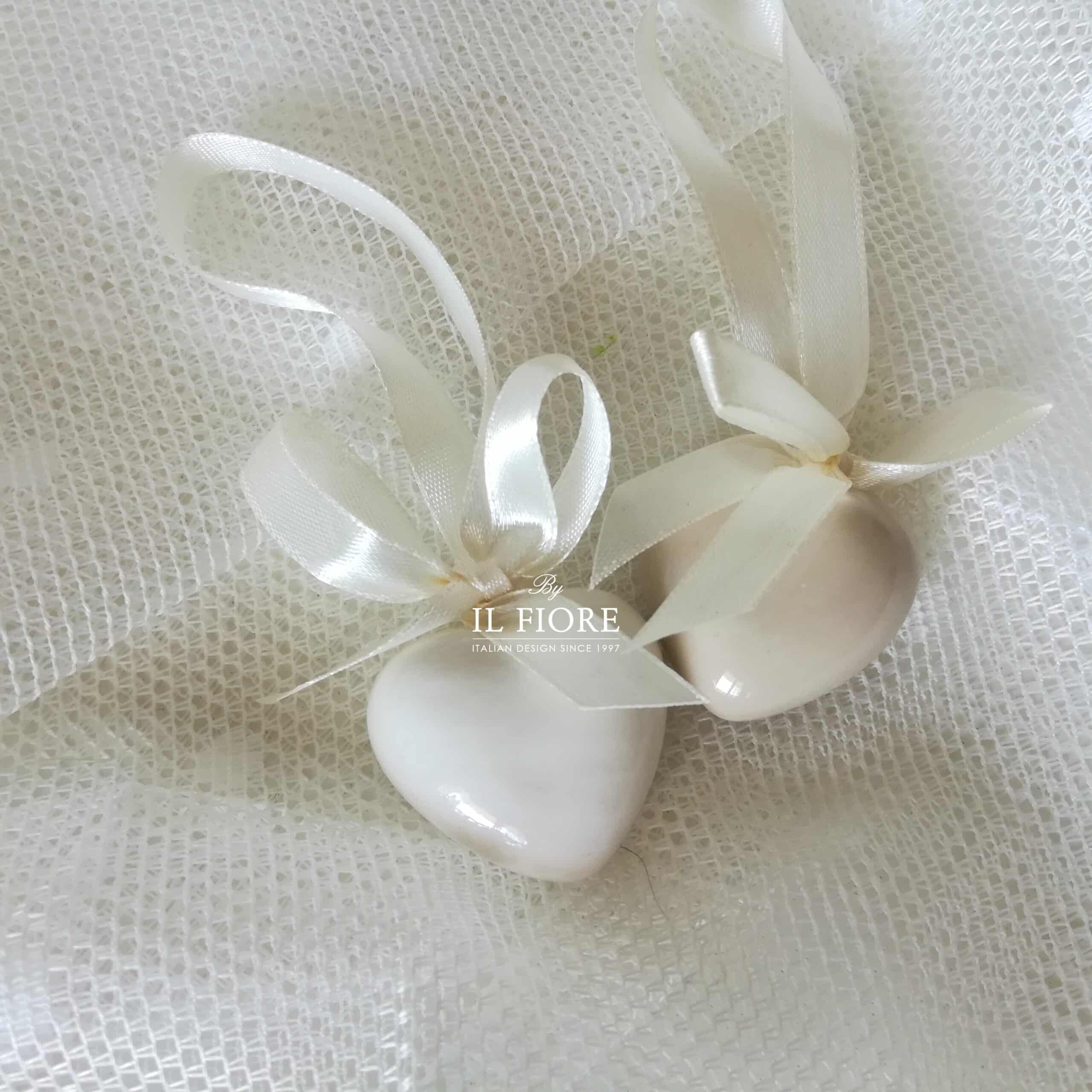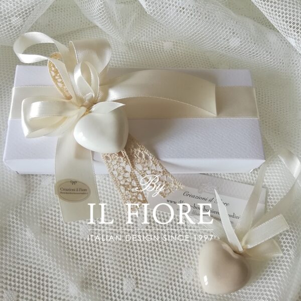 Bomboniera matrimonio. Comunione, Cresima e anniversario di matrimonio, scatola porta confetti con cuori in ceramica con calamita, 25 confetti alla mandorla e biglietto in omaggio. La scatola fuori è decorata con nastro di raso e merletto e cuori in ceramica in due colori.