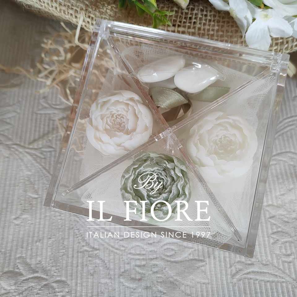 Bomboniera matrimonio scatola portagioie con scomparti, contiene tre candele decorative peonie.