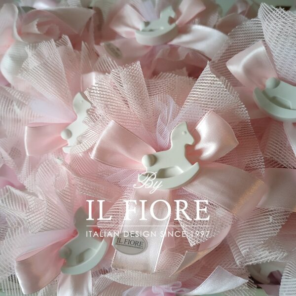 Bomboniera nascita ciuffetto portaconfetti in tulle rosa o celeste con fiocco di raso e gessetti profumati orso, cavalluccio e cuore.