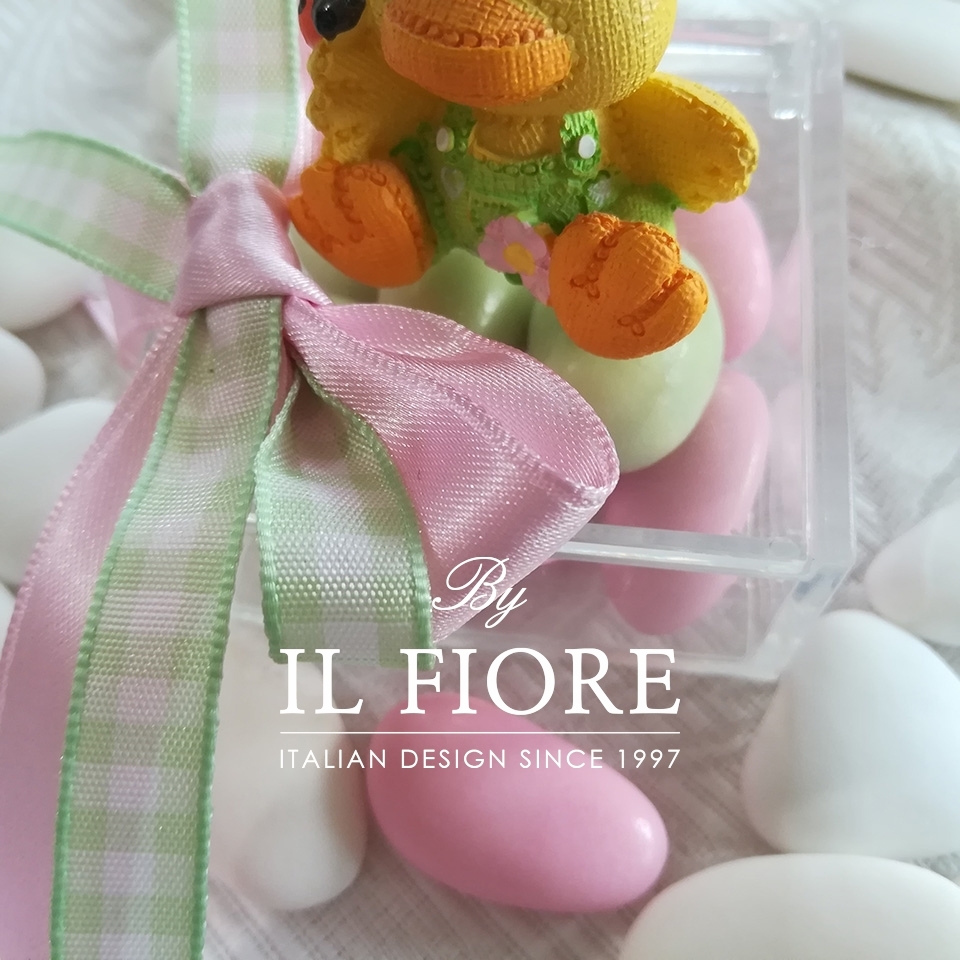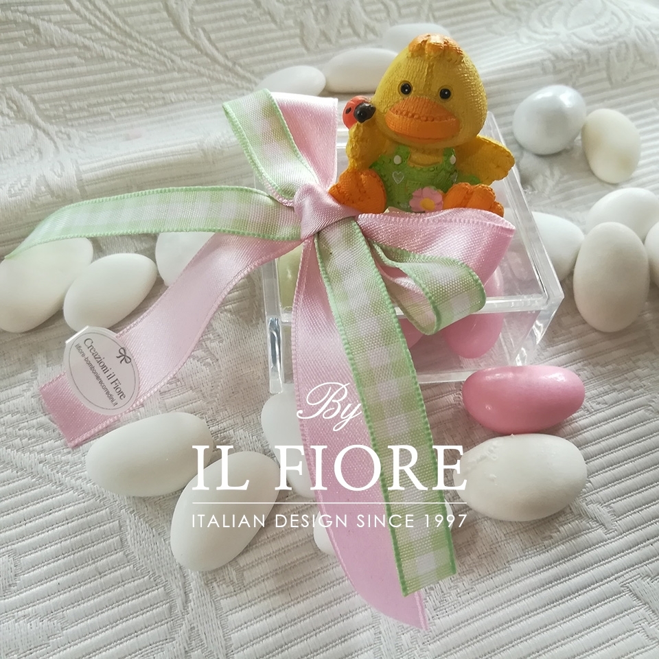 Bomboniera nascita bimba o bimbo scatola in plexiglass con animaletti fattoria colorati e nastri rosa e verde a quadretti.