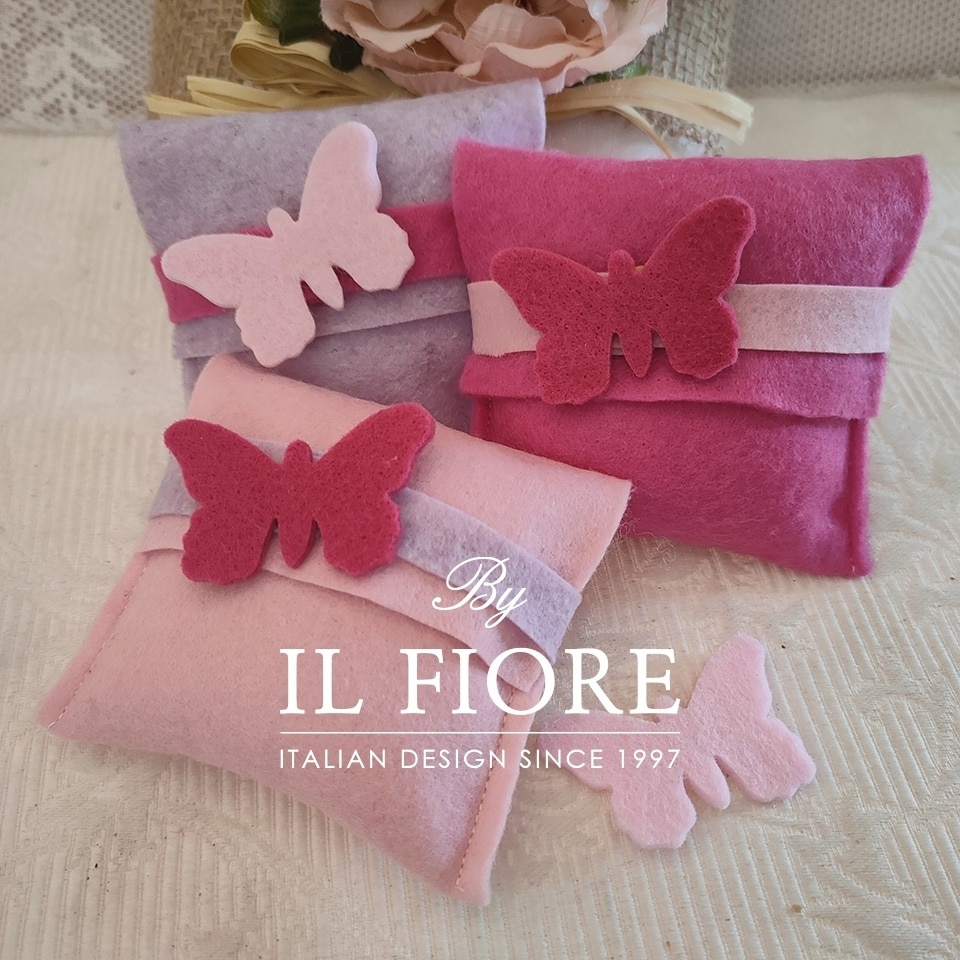 Bomboniera nascita bimba sacchetti busta con farfalla in pannolenci, in tre colori.