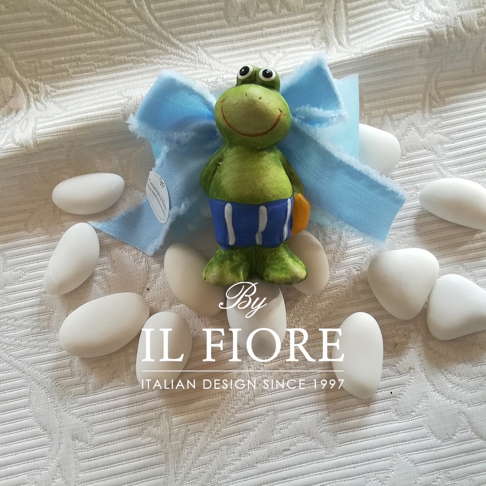 Bomboniera nascita bimbo ciuffetto con pupazzetti marini e nastro di cotone celeste.