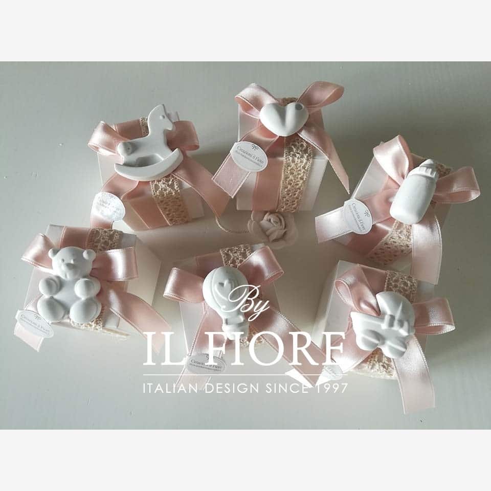 Bomboniera nascita scatola in cartone con nastro in raso, merletto e gessetto profumato. Il colore del nastro si può cambiare in celeste. Misura scatola 6×6.