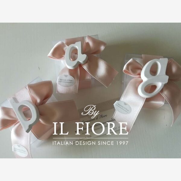 Bomboniera nascita scatola in PVC con nastro in raso e gessetto profumato lettera. Il colore del nastro si può cambiare in celeste e la lettera. Misura scatola 6×6.