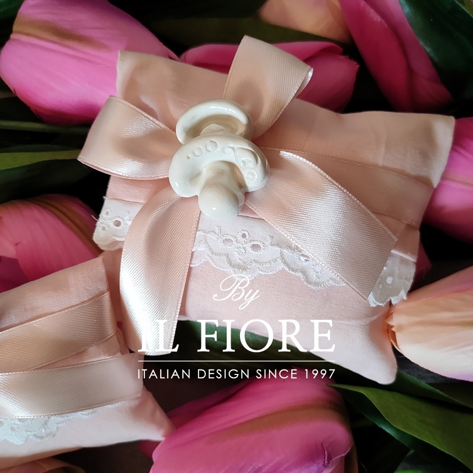 Bomboniera Battesimo sacchetto busta rosa o celeste con pizzo Sangallo, decorata con calamita biberon, ciuccio e piedino in gesso profumato.