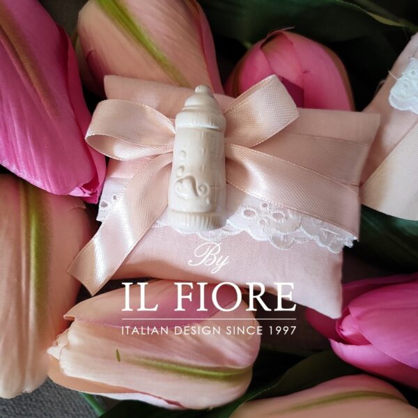Bomboniera Battesimo sacchetto busta rosa o celeste con pizzo Sangallo, decorata con calamita biberon, ciuccio e piedino in gesso profumato.