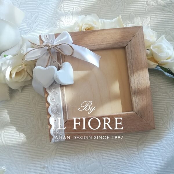 Bomboniera portafoto con cuoricini in legno e Pizzo Sangallo