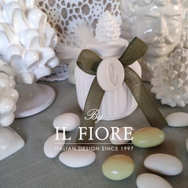Bomboniera Comunione e Cresima, barattolo in gesso con candela. La bomboniera ha due funzioni come portacandele e portaoggetti, decorato con ovale personalizzabile con iniziale e pigna in gesso profumato e nastro.