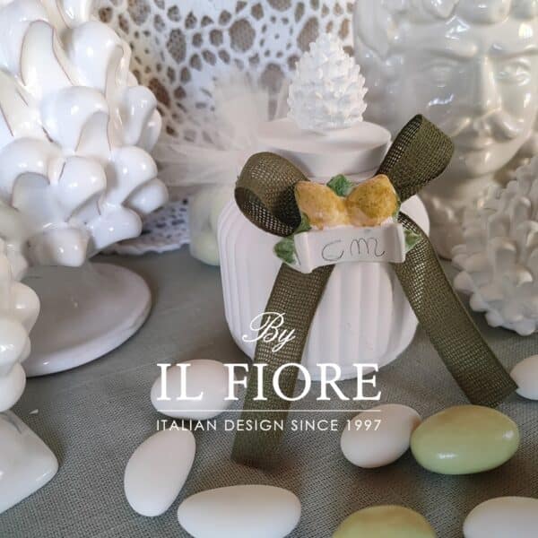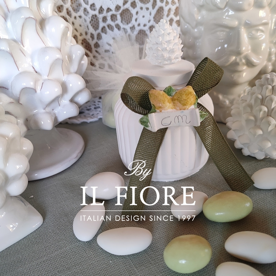 Bomboniera matrimonio, barattolo in gesso con candela. La bomboniera ha due funzioni come portacandele e portaoggetti, decorato con targhetta limoni personalizzabile con iniziali sposi e pigna in gesso profumato e nastro.