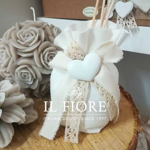 Bomboniera profumatore con sacchetto in lino. Bomboniera utile, profumatore, elegante e originalissimo. Profumatore racchiuso in sacchetto di lino decorato con fiocchi e merletto in cotone e cuore profumatissimo in gesso.