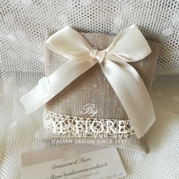 Bomboniera quadrata Juliet della linea Creazione Basic in lino color ecru, rifinita da un delicato merletto e fiocco in raso color avorio.