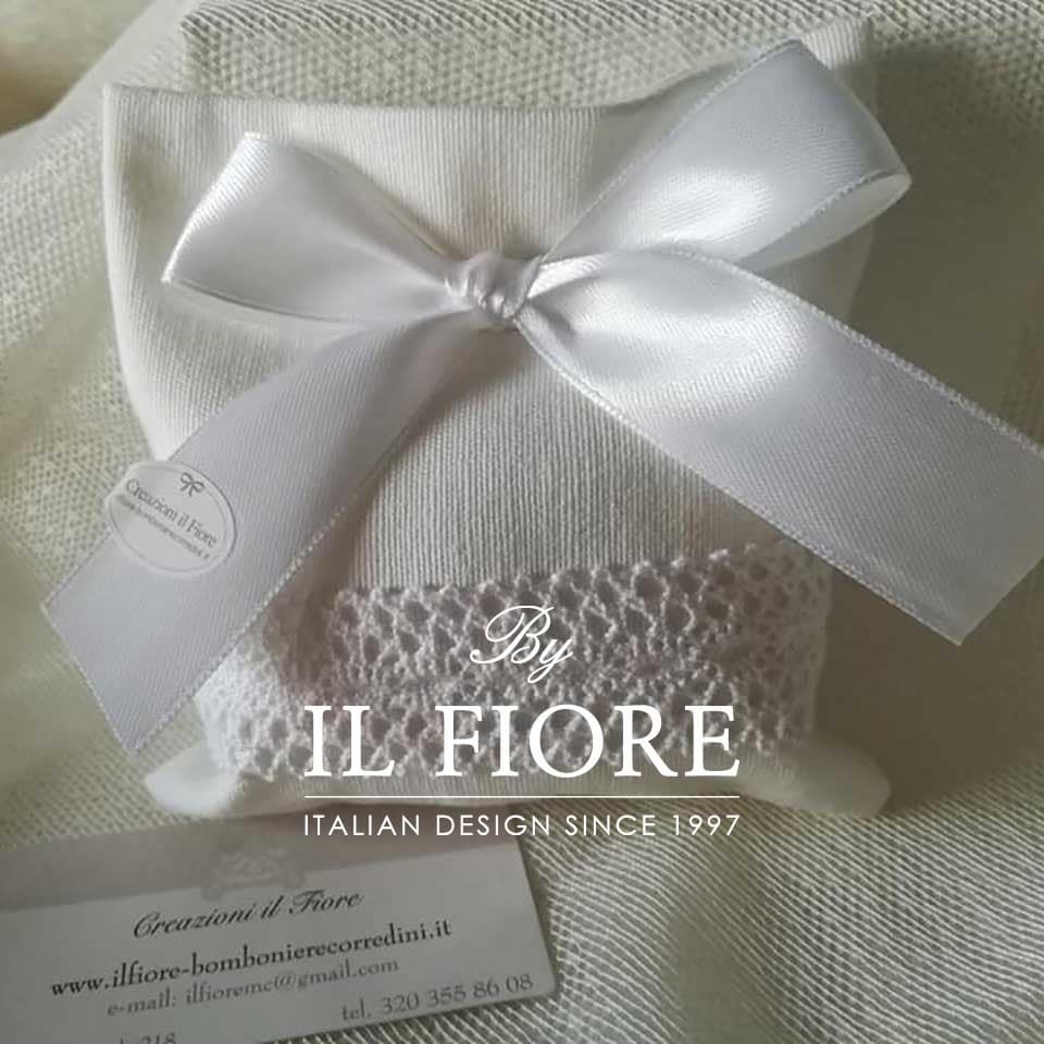 Bomboniera quadrata Sophiette della linea Creazione Basic in cotone con merletto. Decorazione fiocco in raso color bianco. I colori dei nastri si possono cambiare.