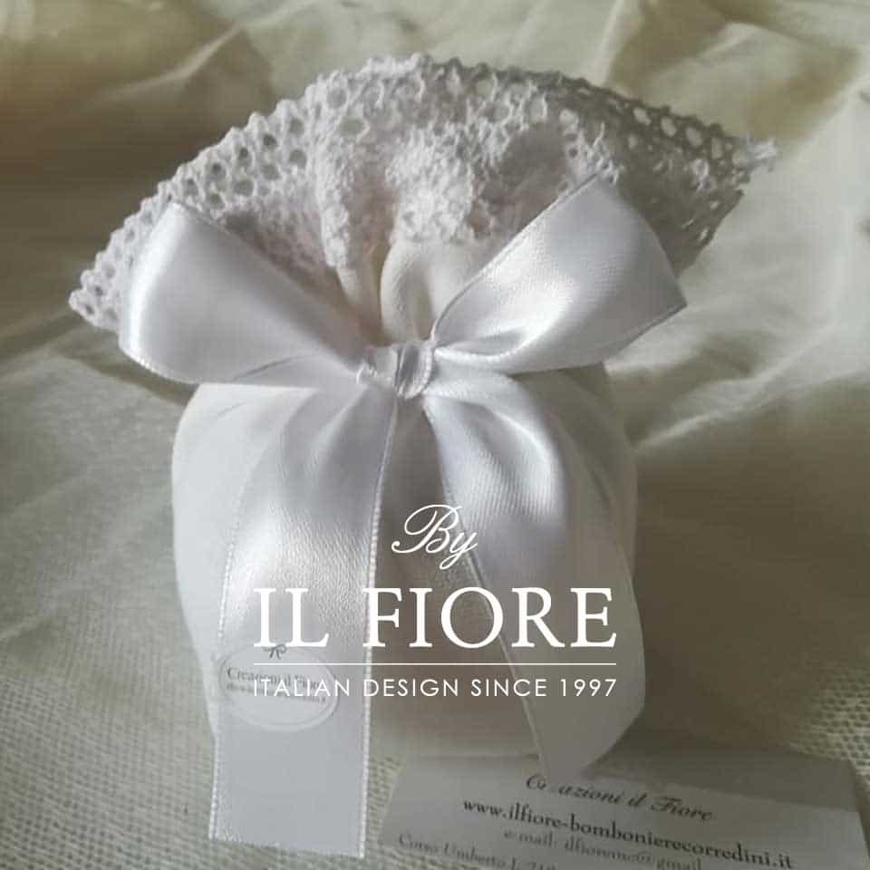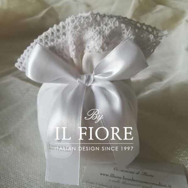 Bomboniera sacchetto bon bon Colette della linea Creazione Basic in cotone con merletto. Decorazione fiocco in raso color bianco. I colori dei nastri si possono cambiare.