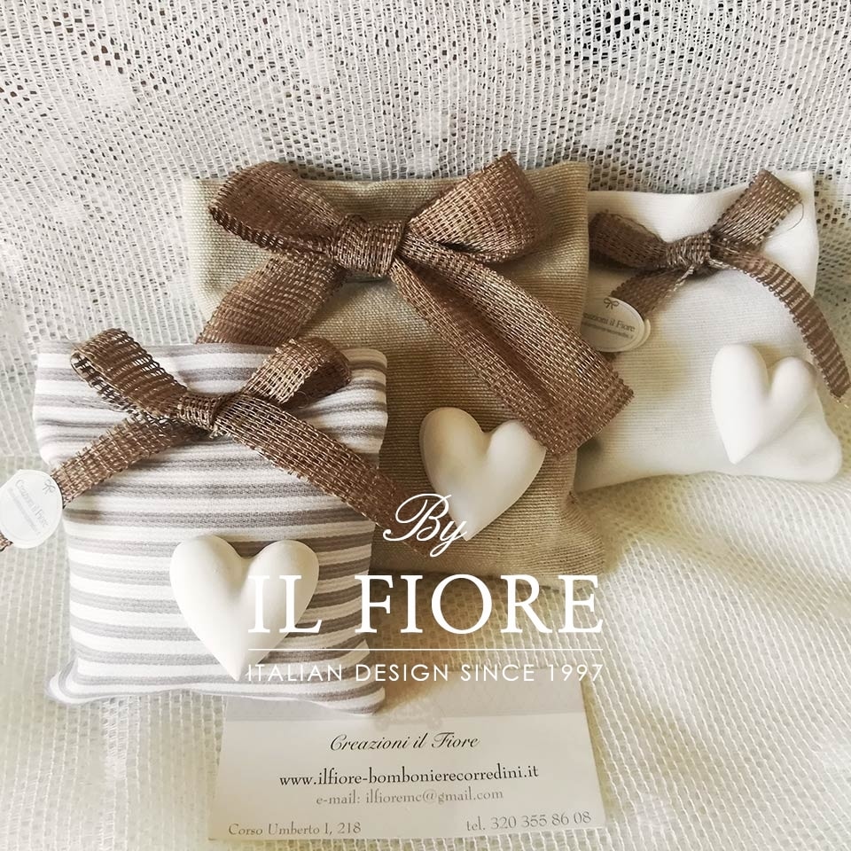 Bomboniera Comunione, matrimonio, cresima e anniversario matrimonio, sacchetto portaconfetti Shabby Chic quadrata in tre fantasie, cotone bianco, cotone tortora e piquet a righe, nastro in lino color tortora gessetti profumati. Possibilità di cambiare il gessetto.